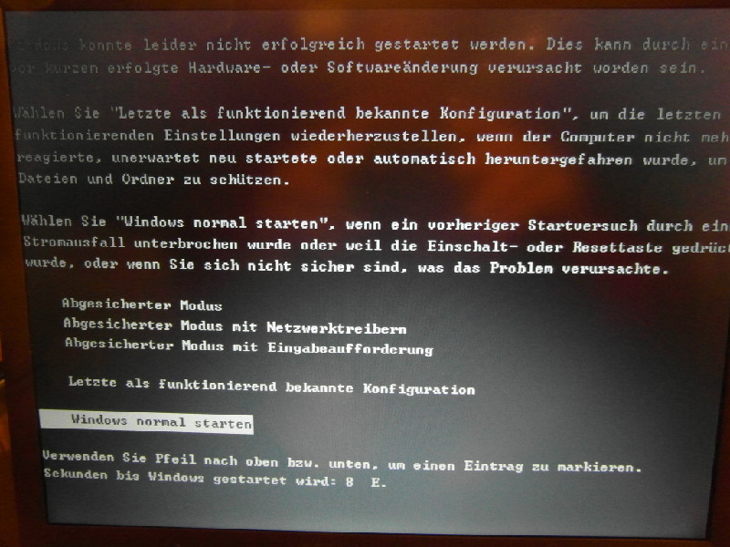 Moin, habe vor 3 Tagen meinen Laptop im Keller entsorgt, weil der Bildschirm schwarz blieb. Ein anderer Alter Kellerlaptop fährt heute Windows XP nicht hoch. Es wird zwar anfangs versucht, kann aber nicht zu Ende geführt werden. Was ich noch sagen kann, die Läppies liefen ohne Accus. Auch im abgesicherten Modus wird nicht gestartet. Gestern lief Alles noch, heute das: