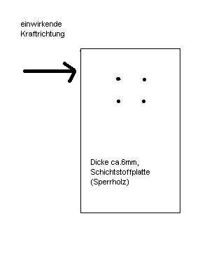 14kg Gas in Alu unter 20kg = 480kg die gegen eine 2cm Dicke Wnd drücken und 160kg rechts und Links Gemeint ist die Erdbeschleunigung "g", die an den Polen g = 9,83m/s² beträgt, in Mitteleuropa bei 9,81m/s" liegt. Die auftretende Belastung F( Kraft) = Masse x Beschleunigung In dem Beispiel 11 kg Gas + 12 kg Flasche = 23 kg Auftretende Kraft = 23X(9,81x20)=ca.460 kg Ich hoffe, nun verlangt keiner von mir eine Dimensionsgleichung, damit man das mit der Erdbeschleunigung und der Masse auch noch richtig errechnen kann :) Aber warum die Angst um die Festigkeit der Schrauben. Es ist ja nicht jeweils nur eine holzschraube eingesetzt, sondern bei meinem Befestigungswinkel sind vier Schrauben benutzt worden, also ist die elastung je Schraube nur noch 115 kg. Das müsste halten. Moin, da muß man statisch etwas weiter denken. 460 kg : 4 = 115 kg, das ist richtig, aber die Wand wird mit 460 kg belastet. Wie stark ist sie und wie ist sie befestigt ? Da habe ich bei manchen Mobilen meine Bedenken, daß sie diese Belastung aushält. , Charly Lag ich doch richtig. Aber ob das Ganze auch für Campinggasanlagen oder für 11kg Tankflaschen gilt ist für mich immer noch offen. Andreas @ bestager, es handelt sich um einen verschraubten und verklebten Gaskasten mit ca. 6 mm dicken schichtverleimten Holzplatten ( früher auch unter der Bezeichnung Sperrholz bekannt ) Qualität sicher ausreichend, welche Holzart aber unbekannt. Hier eine Skizze der Gaskastenwand ![]()