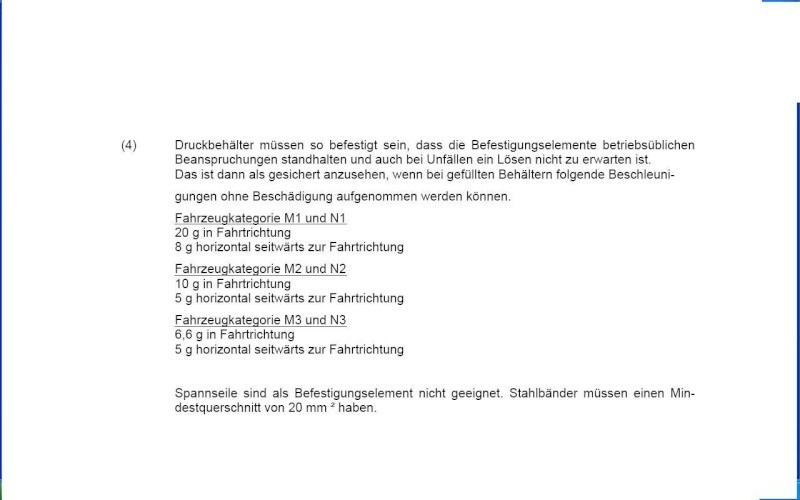 Übersetzt du die 20g/8g mit Gramm/Gewicht oder mit der Abkürzung für g-Kraft bzw. g-Beschleunigung/Verzögerung?? Eine 11kg Füllung + 12kg Stahlflasche haben eine Masse von 23kg. Das Ganze mal 20g (g-Kraft) ergibt meiner Meinung nach 460kg g-Beschleunigung, die dann von den Schrauben gehalten werden muss. (oder liege ich falsch?) Vielleicht stimmt jetzt was mit den Maßeinheiten nicht?? Die Anforderungen habe ich bei meinen Recherchen auch gefunden, ich habe sie aber auf LPG-Anlagen für den Treibstofftank verstanden und deshalb für Campinggasanlagen als nicht relevant betrachtet. Ein Fehler?? Fragend, Andreas