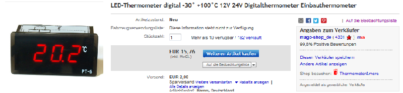 Nö, aber Temperaturüberwachung ist mir wichtiger-eben Prioritäten-! :lach: Thomas hat doch Allround-Thermometer dabei, da sieht man neben der aktuellen Außentemperatur auch das aktuelle Körper- und Fahrzeuggewicht. ;D Hallo und auch hier :dankeschoen: für alle konstruktiven Beiträge! Die zusätzliche Spannungsanzeige würde mich evtl. noch reizen, habe ich vorne im Cockpit nicht. Aber es scheut mich, mir eine weitere Uhr vor die Nase zu halten. Ich werde eh schon zu sehr gehetzt und dauernd dieses Zeit-Messinstrument vor Augen … Des weiteren wollte ich eigentlich auch keine weitere (Interne Backup-) Batterie und evtl. ist mir die Beleuchtung etwas zu "aggressiv". (?) Das erscheint mir ein bisschen teuer, aber wenn es (nachts / bei eingeschalteten Scheinwerfern) auch eine Beleuchtung hätte und man sicher sei könnte, dass man damit "auf ewig" zufrieden ist, dann wäre der Preis akzeptabel. Nicht nur wg. dem Preis möchte ich auch kein RDS-Thermometer. Das gefällt mir gut, zudem der Anbieter durchaus noch mehrere interessante Variationen anbietet: Link zum eBay Artikel oder wohl auch unabhängig von ebay: Link zum eBay Artikel (die zusätzlichen links, damit man es auch später noch findet) Davon werde ich mir wohl eins bestellen, muss nur mal überlegen, welche Beleuchtungsfarbe mir so am besten passt. Zur Genauigkeit der Thermometer: Die ist idR. nur begrenzt vorhanden und Abweichung von 2 bis 3°C sicherlich keine Ausnahme. Nachkommastellen sind da eher überflüssig und suggerieren eine Genauigkeit, die es in diesen Preisklassen kaum geben kann. Sieht vielleicht professioneller aus? ;-) Dazu gibt noch die bereits angesprochen Temperaturverfälschungen durch Einbaulage insbes. während der Fahrt. Trotz dieser Fehlermöglichkeiten finde ich ein Thermometer sehr sinnvoll, insbes. wenn man berücksichtigt, das es auch schon über echten 0°C zu (partiellen) Glatteis kommen kann und man daher bereits ab + 3°C mehr Vorsicht walten lässt. Und natürlich, damit ich protzen kann, auch in meinem Alter noch bei –20°C im Auto zu übernachten! :D