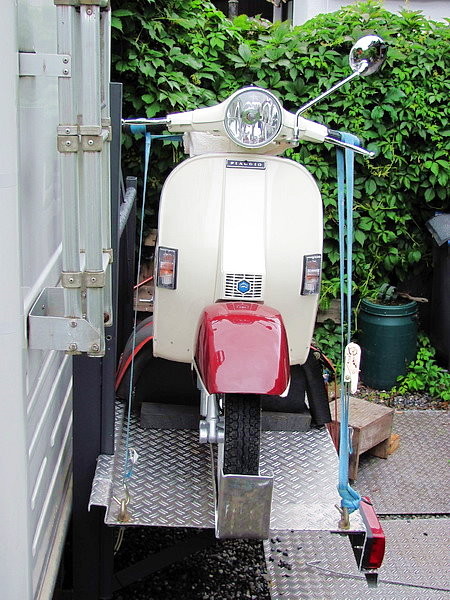 Hallo mit einander . Nachdem ich unter mithilfe von Bekannten ,meine nun 30 Jahre junge Vespa einer Generalüberholung unterzogen habe , mußte eine Akzeptable Transport möglichkeit her. Für die Bühne wurde folgendes Material benötigt; Flachstahl 8*80 C schiene und Rollwagen Hydraulik kolben Doppel wirkend, und eine Grosse Handpumpe ( mit reichlich hub) beim Doppelt wirkenden Kolben habe ich die Möglichkeit zu einem späteren Zeitpunkt , nach montage eines 2 Wege Ventils nebst Umschaltung , und eines weitere Hydraulik schlauches, das FZ nach Unten hin ab-zu-stützen ( scheiss deutsch );-) Kann Euch leider nur ein paar Fotos mit verladener Vespa zeigen , ich hoffe es Gefällt und regt zum Nachbau an ,Plattform ist Absenkbar bis auf 300 mm und max Höhe 800 mm über Erde, so und nun Versuch ich´s mal mit Fotos..
