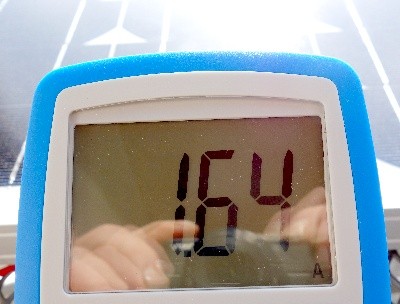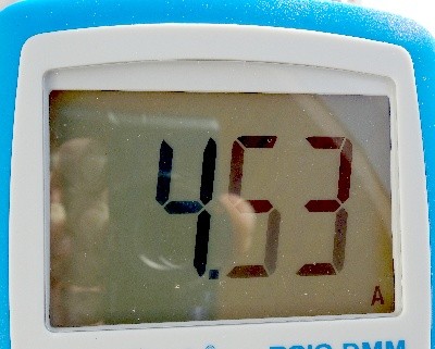 Messung 2: Flach am Tisch liegend: 1,64A. Aber seht selbst: Optimal ausgerichtet: 4,53 A. WOW! Glaubt ihr nicht? Bitteschön: Ja, so kommen wir gut auf 10-20Ah pro Tag. :roll: