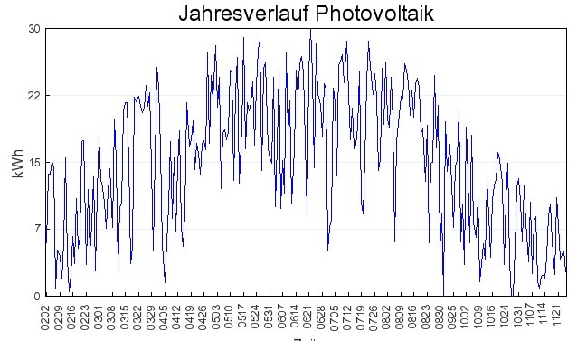 Wie ihr seht kann diese Anlage bis zu 30kWh pro Tag einspielen. Man sieht aber auch, dass sie Tage mit fast 0 und im Februar bzw. November im Schnitt nur noch ca. 5kWh hat. Oder anders gesagt: Sommer zu Winter im Durchschnittsertrag ist ca. 1:5. Und dies bei 30Grad Neigung.