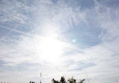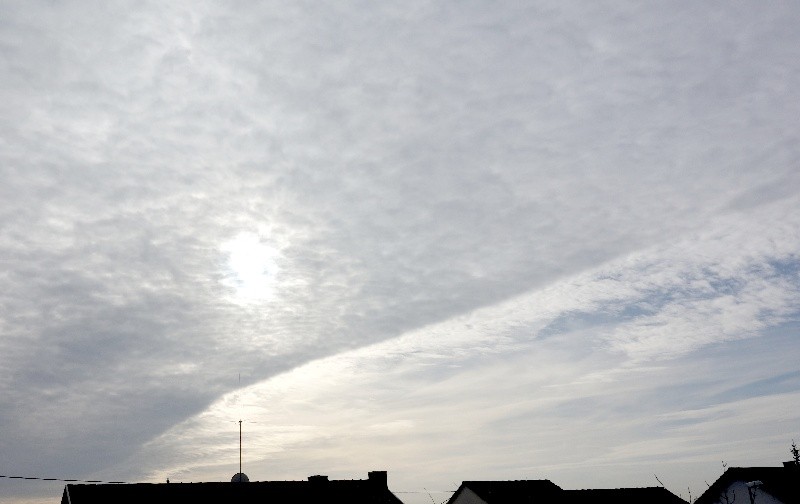 Und so sah der Himmel (11:00 Uhr) zuerst aus: Die Sonne ist von einem Wolkenvorhabg verhangen. Es kommt kein Sonnenlicht ungestört durch, aber wie man so schön sagt: "Die Sonne drückt schon)
