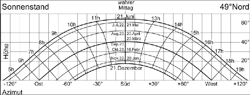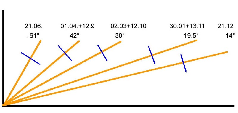 Zur Vereinfachung habe ich mal die Grafik etwas anders dargestellt: Quelle: Raidy Eigenbau (Informationen aus dem Internet). Die blaue Striche stellen dar, wie die Zelle an welchem Datum mittags (für Mitteldeutschland) optimal ausgerichtet wäre. Je mehr ihr nach Süden fahrt, desto "flacher" (liegender) müsste die Zelle stehen, je mehr nach Norden, desto "steiler" (aufrechter) müsste sie stehen.