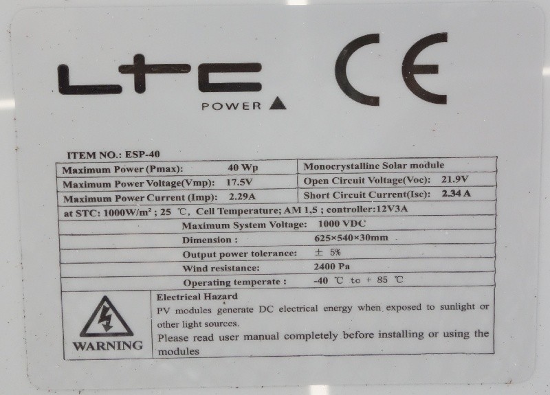 Genau dies will ich euch heute mal rein praktisch zeigen. Hierfür habe ich diesen PV-Koffer aufgestellt: Es ist ein 80 Watt (2x40W) Koffer, wie man ihn zur Zeit immer wieder günstig in der Bucht findet. Ein Blick auf die Moduldaten (eines Modules):