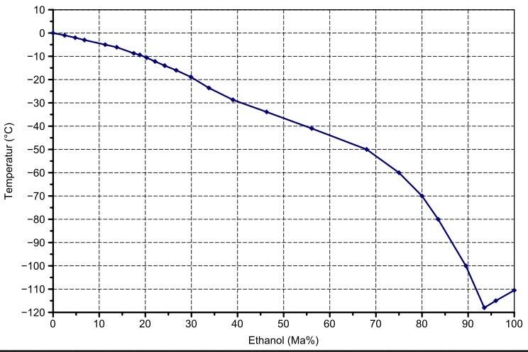 vielleicht ein bisschen OT: zu Beachten ist, dass Gefrierschutz bis 20°C minus gar nicht unbedingt nötig ist. 1. bei Temperaturen um -20°C brauchst du keine Waschanlage. 2. Wichtig ist, dass das Wasser, weder im Motor, noch in der Waschanlage "zu Stein" gefriert, erst dann gibt es Schäden. Wenn das Wasser im Waschbehälter trotzdem "gefriert" entsteht, wenn es tws, Frostschutz drin hat, eine Art "Sulz", das zwar die Düsen verstopft, aber weder Leitungen noch Behälter "sprengt" und dann, wenn du die Waschanlage wieder brauchst, bis ca. -10°C, ist es wieder flüssig ich kauf immer Fertigmischung, da muss ich mich nicht mit meiner " heißgeliebten" Chemie beschäftigen :) schon erstaunlich, wohin eine normale Frage führen kann... @ Volki wieso brauch ich bei unter 10 Grad Minus keine Waschanlage? Diese Grafik ist zeigt das Wasser-Ethanol Mischerverhältnis . ![]() Quelle: wikipedia Rechte und Autor: --> Link Eine Frostschutzmischung hat ein nicht lineares Verhalten. Es findet im Vergleich zu reinem Wasser kein spontaner Übergang flüssig zu fest statt, sondern es kommt zu einer "sulzigen" Übergangsphase mit Einzelkristallbildung, wie ihn manche leider auch schon beim Diesel erlebt haben. Der Hersteller hart also niemanden betrogen, sondern nur die Regeln Physik angewendet. @raidy das mußt jetzt aber schon noch in Kelvin umrechnen. Nicht daß da dann was anderes rauskommt... :D lies mal hier: --> Link und hier:http://www.uni-due.de/~bm0049/Aufgabenkultur/813frostschutzmittel.htm und Entscheidend ist die Dichte des Frostschutzmittels im Verhältnis zur Dichte des Wassers. Vertrau einfach der Beschreibung auf der Flasche. Wird wohl stimmen, was die Leute im Labor ausgerechnet haben. Schönen Advent Habe gerade gekauft. Mich veräppeln die auch! :D ![]() ey leute der Tröt ist gut Informativ, so soll er ja auch sein bitte nicht böse, aber ich schmunzel gel Lancelot. bin zwar grad beim kochen , aber mach mir jetzt ein Kochbier auf :razz: rudolf ehm ne hätt ich bald vergessen , ich kipp rein und gut issssssssssssssssssss :D Lieber Rolfblock, die Kelvinskala hat die gleichen Beträge wie die Celsiusskala. Der absolute Nullpunkt liegt bei - 273,15 Grad Celsius, das sind dann 0 Kelvin. 273,15 K sind 0 Grad Celsius. Punktum. Pegasus