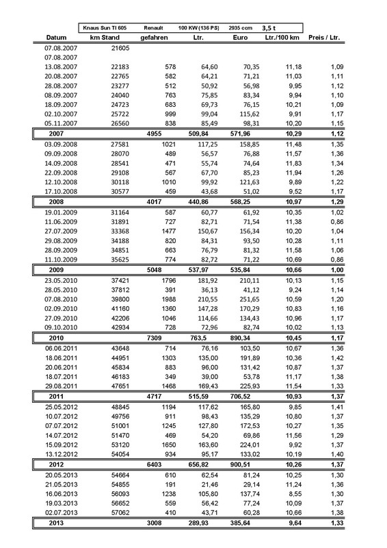 FORD Transit 2.4 l - 140 PS Alkoven >7m und ausgereizten 3,5t. Zwischen 11 - 15l möglich. Im Schnitt um die 13l, fahr viel in den Bergen und eher zügig. bert Rapido 9083 df 3.0 Liter Hubraum 157 PS automatisiertes Schaltgetriebe. Verbrauch ab 10,5 Liter bis 14 Liter. Friedwardt Also momentan gut 7 kg LPG pro Tag, aber das ist ein anderes Thema. Lt. Aufzeichnungen seit 2009 immer Diesel, im Schnitt 16,1 Ltr Iveco 65C18, immer mit Trailer gefahren. Moin Transe 2,5l 78PS 3,5t mit Alkoven "Riva City 540" 10l hinter den LKW´s bis 13l wenn´s mal eilig ist. Christian Wir kommen gerade von einer Südeuropatour zuzrück, gefahren 4200 Km vorwiegend Landstrasse, aber auch Autobahnen Durchschnittsverbrauch 10,7 Liter, Motor 3Ltr. Ducato, 7 Meter Vollintegrierter mit 4,25 To. Fahrweise angepasst, auf Autobahnen und Schnellstr. nicht über 100 KMh. bei ca. 2000 Umdrehungen Ich war selber überrascht von dem- meiner Meinung nach- geringen Verbrauch. Zumal ich bei anderen Reisen mit einem grösseren Anteil an Autobahn KM ca. 2,0 Tl. mehr verbrauchte. Hallo Transe 2,4 L 140 Ps 11.5l bis 14l bei einem TI und 4t Gewicht. didje Moin,moin, unsere Werte bei Spritmonitor, ermittelt mit 4 verschiedenen Fahrern, dabei Touren durch die Berge, aber auch im flachen Dänemark. Womo: TI Duci230, 3,4t, 6m, --> Link Bernd Hallo Knaus Sun Treveller 650 auf Renault Master 3.0,136 PS Alkoven Bj 2006 im Durchschnitt 13 Liter Wir haben mit unserem Fiat Ducato mit 101 PS auf den letzten Touren immer ca. 8,5 - 9,5 L auf 100 KM gebraucht. Durchschnitt ca. 100 Kmh. Der hat aber teilweise auch echt die Berge hoch gemusst... also ich bin absolut zufrieden. Wir fahren einen Carthago Mondial 62 L auf DB 616 cdi 2,7 L 156 PS mit Wandlerautomatik und 5990 kg zGG. 8,8 m lang 2,38 m breit und 3,40 m hoch mit Alkoven. Verbrauch zwischen 19 und 20,5 L :D Winni Ich habe leste Woche zwieschen Bergen bei Celle bis nach Norderstedt Mit einen Weinsberg Alkoven Fiat 244 mit 110 Psfür ca 300 Km 8,6 l verbraucht .Hab zweimal nachgerchnet FORD Transit 2.4 l - 140 PS Alkoven, 7m und ausgereizten 3,5 T. Im Schnitt nach Bordcomputer 11,1 Liter. In der Regel Tempo 100 nach Navi. Wenn mich einer nervt, gerne auch mal 140 für ne kurze Strecke, dass ich den Affen los bin. ;-).