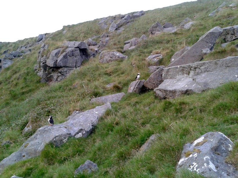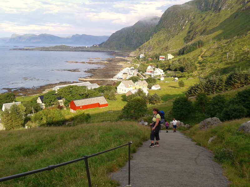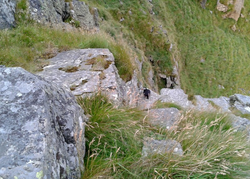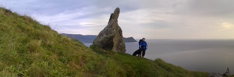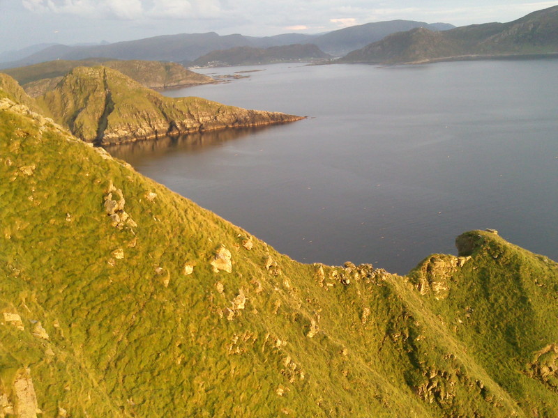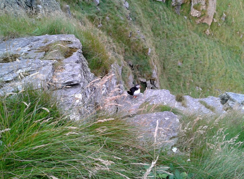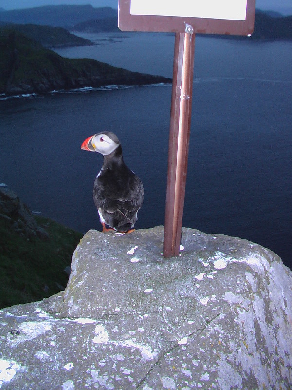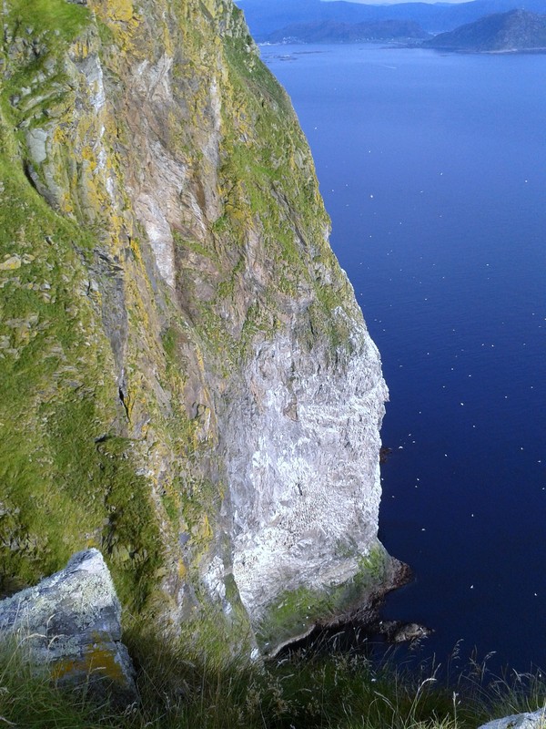 Gemäß der empfehlung vom CP-chef Knut sind wir nach dem 3.gattertor rechtsab gebogen zum Tinden. Vorher hatten wir aber noch eine kurze heftige bekanntschaft mit einem jungen schafbock, welcher sich oberhalb der 2.gattertür auf dem weg plaziert hat und die bergaufströmenden vogelbeobachtermassen entweder wegen einem lecGast anbettelte oder mit gesenkten kopf attakierte - ähnlich einer tierischen mautstation oder tierisches raubrittertum. Er hat aber nicht mit einem gegenangriff von unserem uns immer begleitenden womowachhundes gerechnet. Das ging alles so unerwartet und schnell das es davon leider keine bilder gibt :( Ein kurzvideo dieser "tierischen mautstations" - begegnung wär der hammer gewesen :lol: . Jedenfalls mit unserem "AUTOPASS-hund" ist es uns möglich vorbei zu kommen und dem schafbock ist dann auch die lust vergangen uns und nachfolgende passanten weiter zu belästigen. Irgendwie hab ich das gefühl, das Knut durch seine auskünfte und tourvorschläge den touristenstrom zu den vogelfelsen etwas steuert. Wir waren fast die einzigen, welche den tourvorschlag gegen den uhrzeigersinn bekommen, denn wir hatten nur gegenverkehr. Auch der zeitplan ist pro tourvorschlag gut berechnet und man kommt an den vogelfelsen am abend ca eine stunde vor bis zum sonnenunergang an, wenn die meisten altvögel zu den felsen zurückkehren. Unsere tour führte dann vom Tinden, Skarveura, Raudenipa, über Rundebranden, Kaldekloven bis Lundeura. Die wege sind mit zweckmäßigem wanderschuhen gut begehbar und gut ausgeschildert. Man sollte allerdings mindestens die kleine infokarte, welche man in der cp-rezeption bekommt, dabei haben, wenn man noch ortsunkundig ist, damit man weiß wo man sich gerade befindet. Bis auf den beobachtungsplatz Lundeeura hält sich die anzahl der vogelbeobachter in vertretbaren grenzen und die rückkehrenden altvögel wurden nicht beim anflug der felsen gestört und man kann schöne beobachtungen machen. Leider haben wir nicht etwas proffesionellere fotoausrüstung für bessere detailaufnahmen, wir fotographieren nur mit Samsung smartphones.