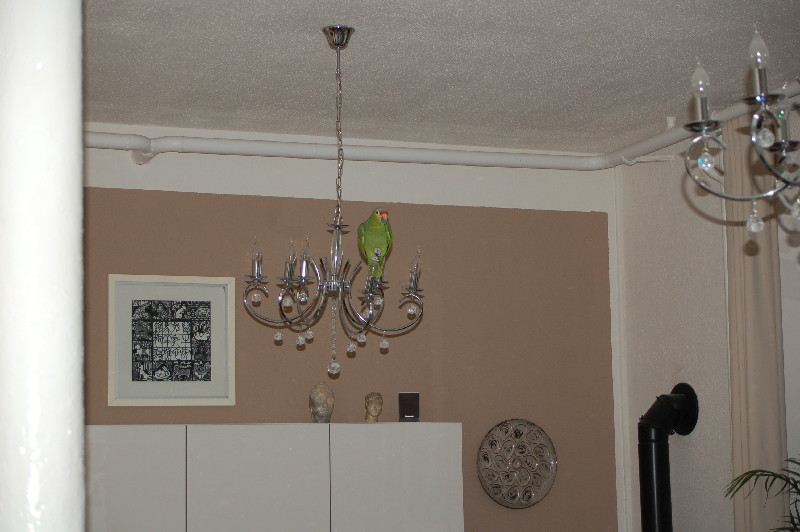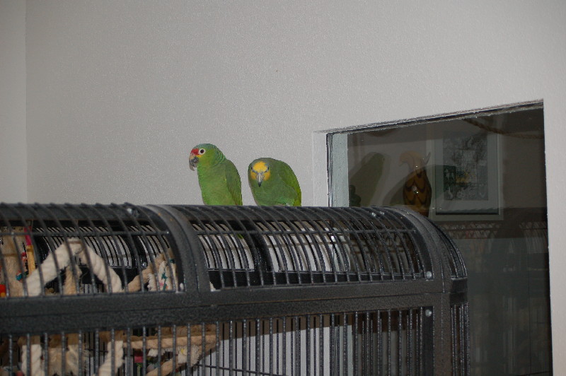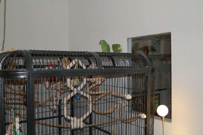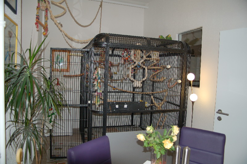 Ich hab da noch zwei Staubigeien, die nicht unerheblich Dreck und vor allem Krach machen. Neun Jahre wohnen Coco (gelb) und Olli (rot) nun schon mit uns und machen richtig Freude. Coco haben wir aus schlechter Haltung in einem Raucherhaushalt mit winzigem Käfig geholt. Er ist leider ein Wildfang und sein Flügel wurde so miserabel gestutzt, daß er nur runterfliegen kann mittlerweile, hoch immer klettern muß.