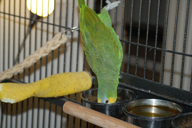 Sie streiten, spielen und liebkosen sich wie füreinander erfunden. Olli ist eine Handaufzucht und war handzahm. Da beide voneinander lernen, muß man nun etwas Respekt zeigen. Olli kommt weiterhin auf die Schulter, beißt er aber, dann fließt Blut. Coco nimmt Futter von der Hand, läßt sich aber nur auf die Hand nehmen, wenn sein Flugversuch mal wieder daneben ging. Er täuscht Bisse nur an, es ist lustig, wenn er mit seiner Zunge (Ja die Biester haben richtige Zungen) die Finger untersucht. Das Allergrößte für die Beiden ist die Dusche mit der Blumenspritze.