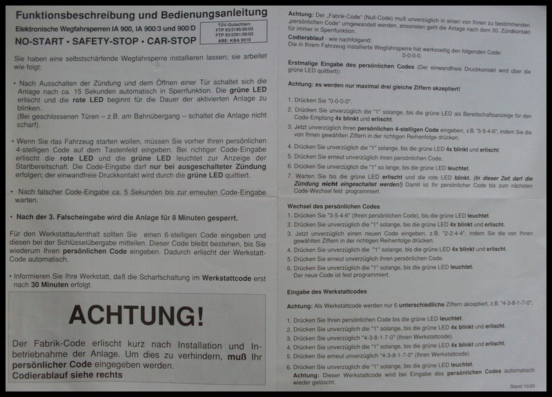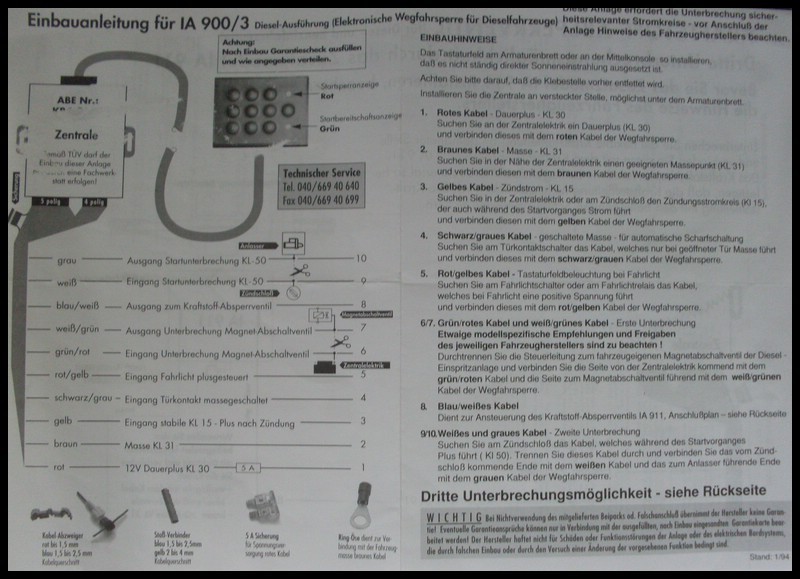 Hallo W.F. wenn du diese Wegfahrspeere meinst, Wegfahrsperre der Fa. INTERALDU Auto-Sicherheits-System GmbH aus Hamburg. Die Bezeichnung der Wegfahrsperre lautet IA 900/3 und die KBA Nr. 9519 , da könnte ich dir einen Tipp geben, aber nur über PN weil das auch Böse Buben Lesen könnten :D . Markus ![]() ![]() ![]() Hallo Falk6700, hatte auch immer Probleme mit der Wegfahrsperre meines Eura auf Basis Fiat Ducato 230. Ultima Ratio: Habe sie von einer Werkstatt ausbauen lassen, da ich der Meinung bin, dass der Diebstahl eines Womo sehr sehr unwahrscheinlich ist und somit eine funktionierende WSp keine höhere Sicherheit bringt, sondern nur potentiellen Ärger. Das Stilllegen kostete ca. 80 Euro statt 800 für den Einbau einer neuen. Dirk Cool, Markus! Wo hast Du denn diese uralte Anleitung noch her??? :?: :?: Die Firma Interaldu aus HH ist schon seit vielen Jahren pleite! Die Ära der Wegfahrsperren ist ja auch schon lange vorbei. Heute installiert man CAN BUS Alarm und Ortungssysteme. @Falk6700 Ich hätte auch eine Idee wie man die alte Wegfahrsperre deaktivieren könnte. Aber ich schließe mich Markus an, nur per PN! Klaus