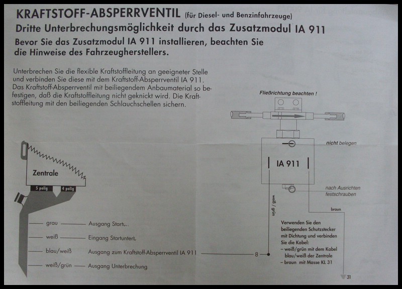 Hallo Klaus, Ich habe diese in meinen Unterlagen aufbewahrt da ich diese Wegfahrspeere verbaut habe. Markus Hallo Markus! Freut mich das Sie dann noch funktioniert. Wir haben damals viele Wegfahrsperren verbaut, aber nicht Interaldu, da wir vom Tastenfeld nie begeistert waren. Heute verbauen wir viel Analog- oder CAN Alarm und Ortungssysteme mit Stromkreisunterbrechung "per SMS". Ja, ja, die Zeiten haben sich verändert.... :roll: :roll: Da wir dem Kollegen Falk6700 wohl nicht mehr helfen brauchen, können wir unsere Ideen auch für uns behalten :lol: Klaus Hallo meine Wegfahrsperre i900/3 blinkt rot und habe keinen Code. Batterie war platt und nun bekomme ich die Sperre nicht mehr deaktiviert. Safety Stop ia900/3 Kann mir jemand helfen? Hast du ein zusätzliches Absperrventil verbaut ? Oder läuft die Anlage über das serienmäßige Absperrventil? Auf die schnelle wird nur ausbauen möglich sein...es sei denn hier weiß jemand die Prozedur der Rücksetzung auf Werkseinstellung Keine Ahnung ,wollt es starten zum jährlichen check und nun blinkt es rot und das Womo sagt keinen Ton mehr... Das versteh ich jetzt nicht. Du hast keinen Code? Wie hast du denn früher die Wegfahrsperre deaktiviert? Habe es vor 2jahren gekauft und nie drauf geachtet bzw nie aktiviert,Code war also nie notwendig.War aber etwas am blinken .habe genauso eine Anleitung wie hier schon abgebildet,aber keinen Code . Vorbesitzer ist verstorben,den habe ich als erstes heute versucht zu erreichen.lg aus dem Emsland Da haben wohl die Einbauprofis den Türkontakt weggelassen und das Ding wurde nie automatisch scharfgeschaltet. Erst jetzt durch deine tote Batterie ist es dann passiert. In deinem Fall bleibt da wohl nur der Rückbau. Wenn du es ordentlich machen willst, dann verfolge mal das graue und das weiße Kabel. An deren Ende befindet sich ein durchgetrenntes Kabel. Das mußt du, nachdem du die beiden Kabel abgemacht hast, wieder verbinden. Das gleiche machst du mit dem weiß/grünen Kabel und dem grün/roten Kabel. Du kannst aber auch erstmal testweise die Box abziehen und die beiden Kabelpaare provisorisch kurzschließen. Sollte auch das Kraftstoffabsperrventil verbaut worden sein, was mich wundern würde, mußt du auch noch das blau/weiße Kabel mit dem roten Kabel verbinden. Wenn es dann läuft kannst du aufräumen. Du kannst natürlich statt des Kurzschließen auch für ein Kabelpaar einen vesteckten Schalter benutzen. Dann hast du zumindestens noch eine Hilfswegfahrsperre. So erstmal danke für eure Hilfe,konnte den Sohn des verstorbenen Vorbesitzers ausfindig machen.Der sagte mir zwei Nummern und gleich die erste passte sofort...zum Glück. Der Tag ist gerettet |