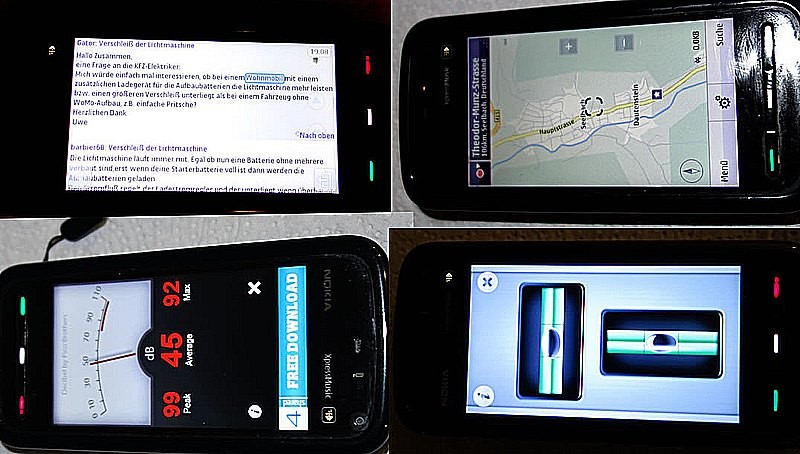 Nochmals, weil mir das wichtig ist: Ich will diese smartphones nicht schlecht machen. Wer mit den kleinen Bildschirmen und der Touch-Bedienung zurecht kommt soll glücklich damit werden. Aber wenn ich so manche Riesen-smartphones sehe, die eigentlich schon eher Telefonier-Tablets sind :? Wobei das mit den Apps schon lustig sein kann: Surfen mit HSDPA, navigieren zum Stellplatz , Lautstärken messen und vergleichen ("ungefähr" Dezibel-Meter) und Wasserwaage zum ausrichten.... gab es eben auch schon vor 5 Jahren. So neu ist die Idee mit Apps und Co. nun auch wieder nicht.