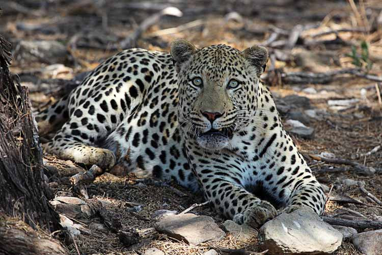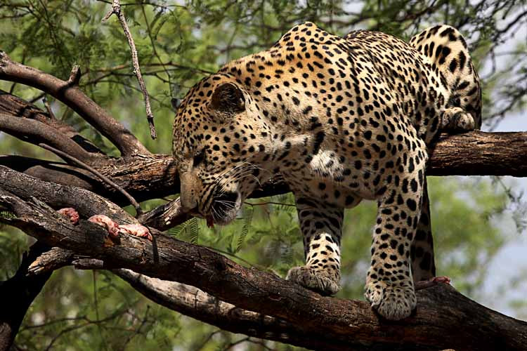 Durch ein verschlossenes Tor geht es zum Leoparden. Der Fahrer legt Hühnerhälse als Futter auf einen Baum, um dann ein paar Meter zurückzufahren. Da kommt auch schon der Leopard und springt mit einem kraftvollen Satz auf den Ast. Wir kommen zu tollen Fotos.
