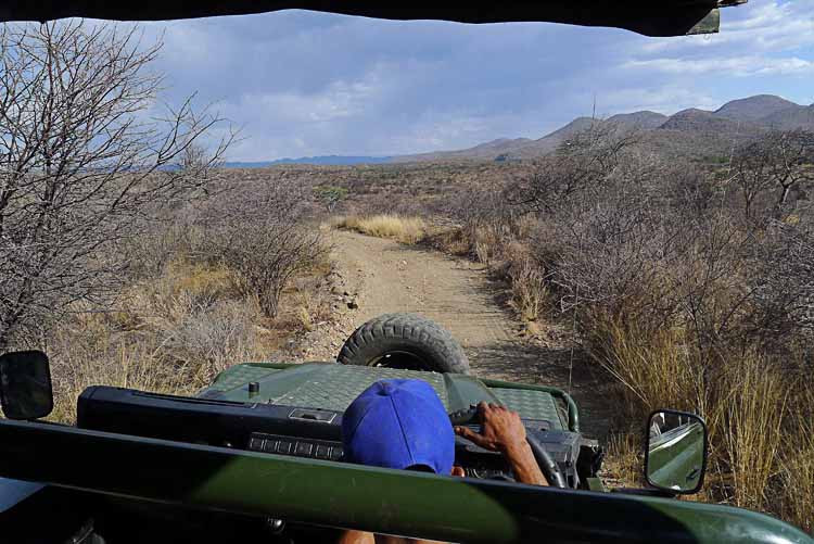 Tag 29, Donnerstag, 8. November 2012 Die Nacht ist sehr heiß. Frühstück kurz vor 08:00 Uhr. Meine softboilled Eggs sind wirklich weichgekocht. Dann fahren wir zu African Tracks, die Autos wollen zurückgegeben werden. Das funktioniert ohne Probleme, wir werden wunschgemäß ins Zentrum von Windhoek zurückgefahren. Wir ziehen noch einmal N$ 1000,- aus einem Geldautomaten, dann stürzen sich die Damen ins Einkaufsgeschehen. Eine CD und ein Plüschaffe für Clemens müssen noch sein. Peperl und ich machen uns gegen 10:30 Uhr auf den Heimweg zum Hotel. Die Sonne sticht schon wieder, es hat sicher 30 Grad im Schatten. Gerade die richtige Temperatur für einen Gin Tonic am Pool. Um 14:00 Uhr werden wir abgeholt, ein Ausflug zu einer Farm ist geplant, auf der wir Leoparden und Geparden sehen werden. Wir fahren ca. 1 Std. Richtung Norden, um dann links zur neuerbauten Hühnerfarm abzubiegen. Ab hier geht es langsamer, die Straße ist nur geschottert. Unterwegs sehen wir Warzenschweine und eine 10-köpfiges Oryxherde. Bei der Game-Farm angekommen zeigt uns unser Fahrer zuerst die Terrasse des Farmhauses. Dann steigen wir auf einen offenen Landrover um, wir erwischen noch die 1. Reihe.