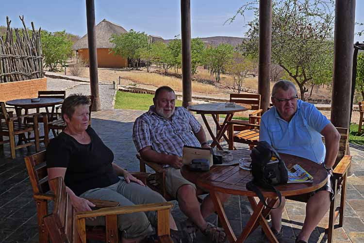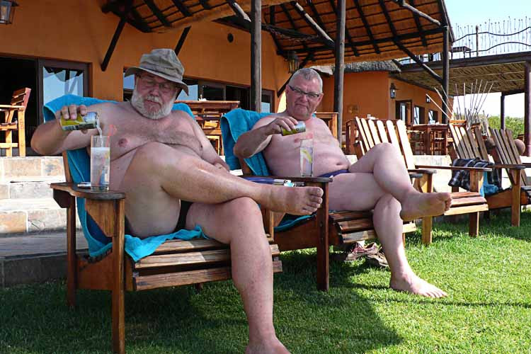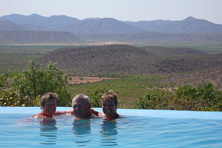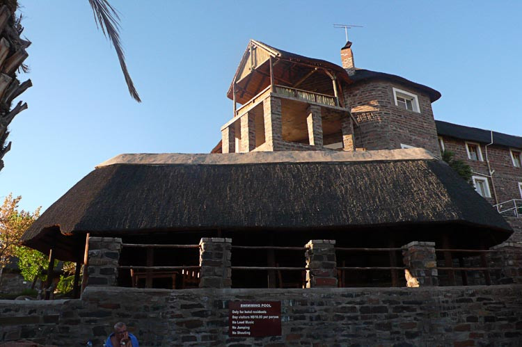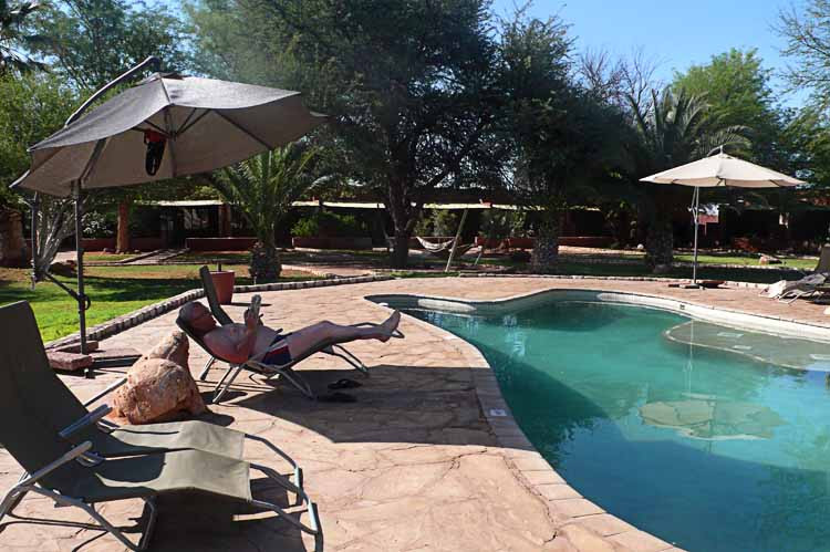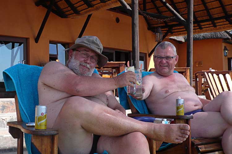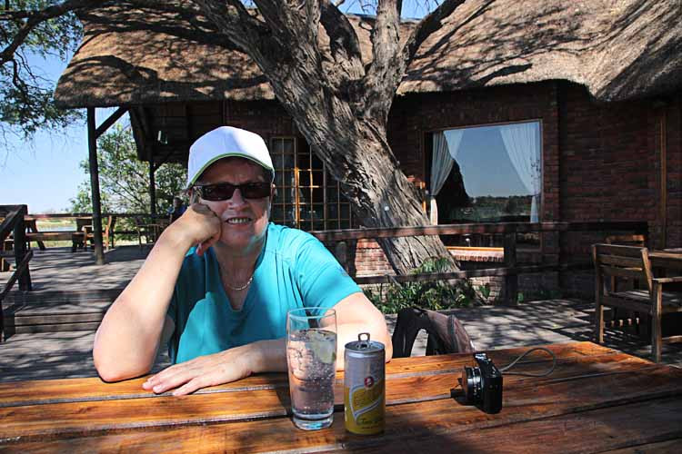 Dafür bestellen wir uns aber auch noch ein Abendessen, 4 Gänge werden angeboten. Als Hauptspeise gibt es heute Springbock Stroganov. Nach dem Zimmerbezug legen wir uns an und in den Pool, nur unterbrochen von einer „Malariaprophilaxe“, nämlich einem oder zwei Gin Tonic. Das Abendessen schmeckt herrlich, zur Vorspeise gibt es Gartensalat mit getrocknetem Fleisch, dann eine Gemüsesuppe und als Hauptspeise vorhergesagten Springbock Stroganov. Als Dessert dann noch einen Apfelkuchen in warmer Vanillesauce. Nachdem wir um 22:00 Uhr wieder einmal die letzten Gäste sind, fallen wir in die Betten.