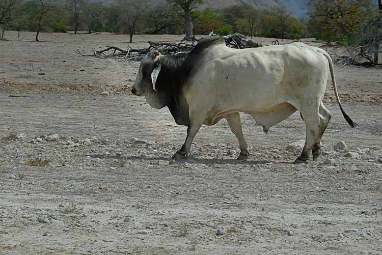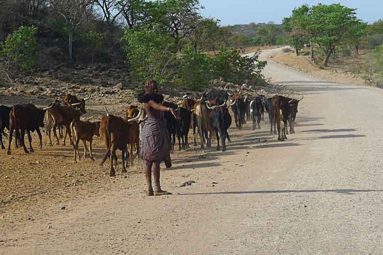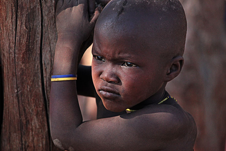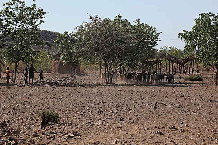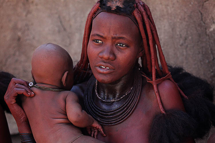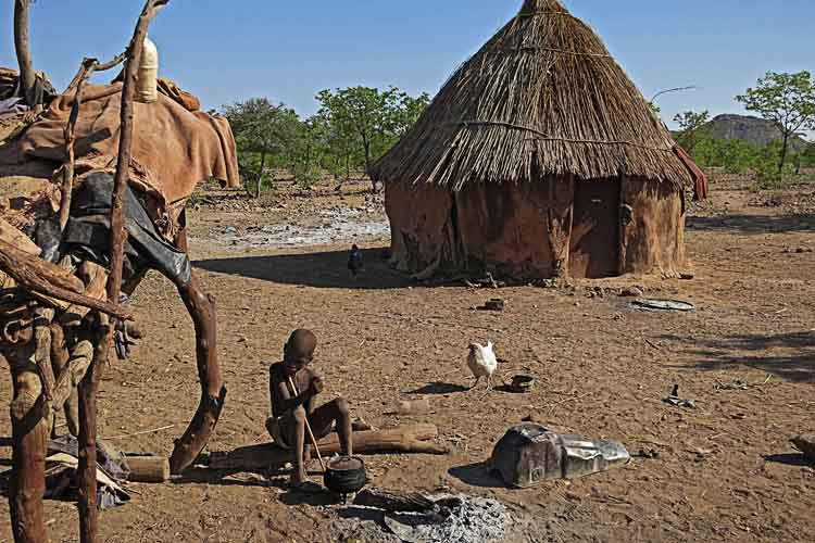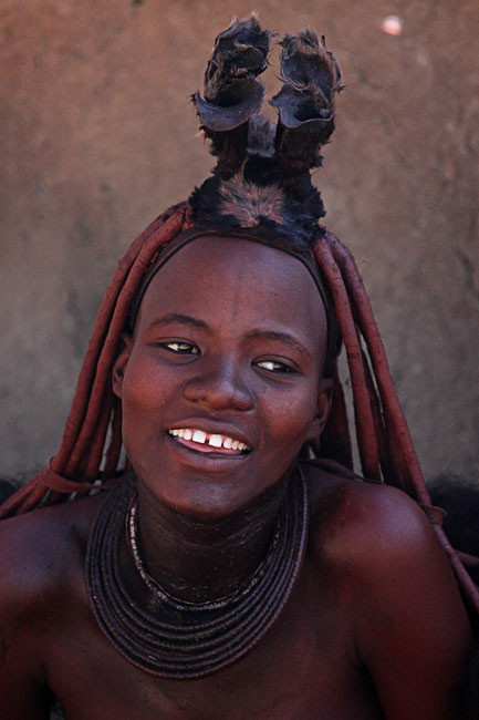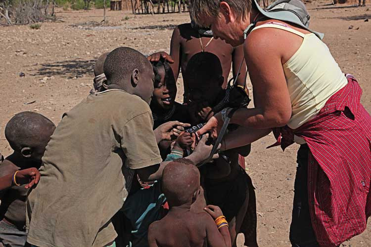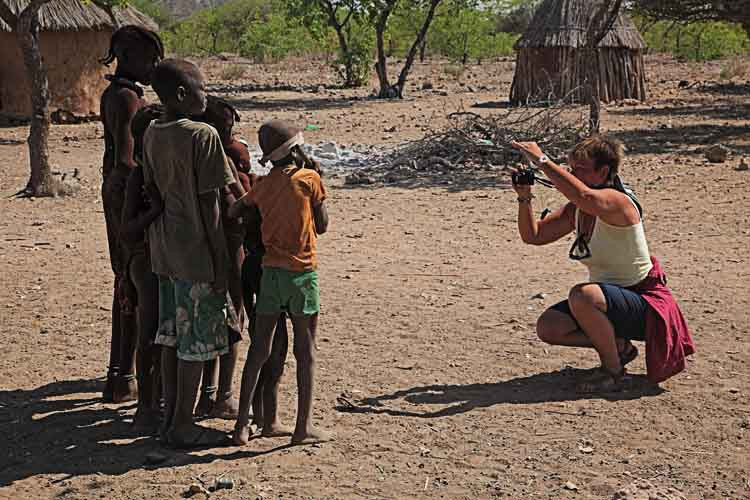 Tag 16, Freitag, 26. 10. 2012 Um 06:45 gehen wir frühstücken. Um 07:30 Uhr kommt unser Guide mit dem Auto, um uns in ein kleines Himbadorf in der Nähe zu bringen. Wir werden noch über unser Benehmen bei den Himbas aufgeklärt, so gibt man jedem die Hand (ohne festen Händedruck) und sagt höflich: „moro moro“. Auf die Frage, wie es einem geht, antwortet man mit: „naua“, endlich eine Erklärung für dieses Wort. Er erklärt uns auch noch, wie man Danke sagt, nämlich mit: „oku hepa“. Dann geht er zum Stammesältesten, um die Besuchserlaubnis zu erfragen. Nach 2 Minuten ist er wieder da, wir werden willkommen geheißen. Natürlich stürmen wie überall zuerst die Kinder auf uns los, sie wollen jedes Foto dann im Display anschauen und haben dabei dann viel zu lachen.