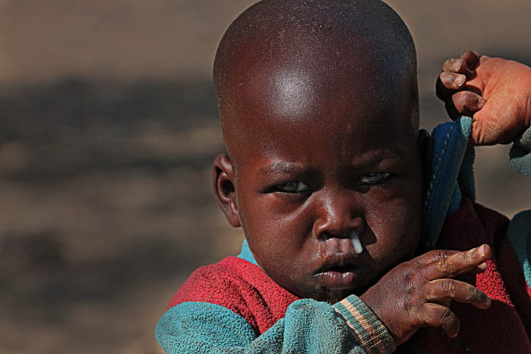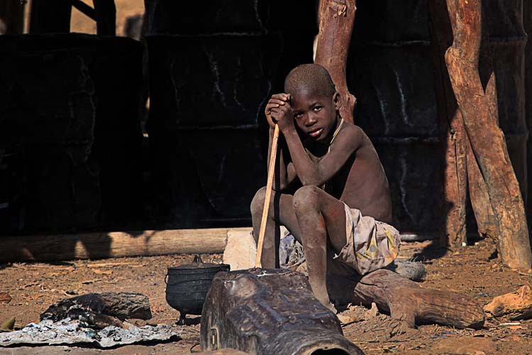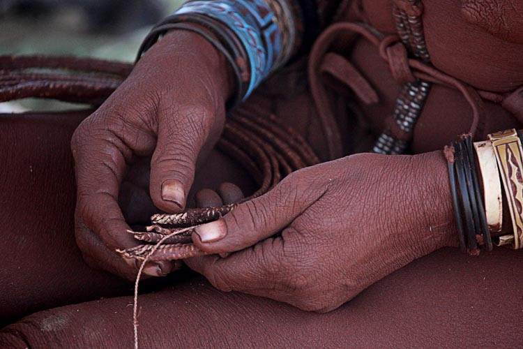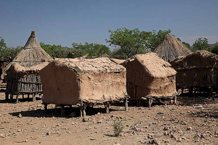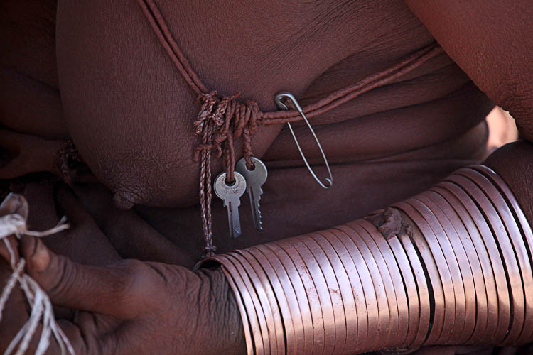 Dann gehen wir zu den Erwachsenen um überall Hände zu schütteln und moro, moro, moro, moro zu sagen. Der stammesälteste und zugleich Oberhaupt der Sippe hat keine Beine und fährt in einem alten Rollstuhl. Er fragt mich um eine Zigarette, die ich natürlich nicht verwehre. Wie ich später sehe, geht die Memphis dann aber reihum. Während wir in einer der Hütten sind, wird draußen der Shop aufgebaut. In der Hütte sitzt eine Frau und zeigt uns die Körperpflege. Frauen waschen sich nie, auch nicht nach der Geburt der 10 - 15 Kinder. Sie schmieren sich mit Butter, die mit roter Erde vermischt wird, den Körper ein. Zur Vermeidung von Körpergeruch räuchern sie sich mit wohlriechenden Hölzern ein. Die Haare werden im Abstand von 3 Monaten mit frischem Kuhdung in Form gebracht, überdeckt von Holzasche.In der Hütte riecht es wie in einer Selchkammer. Sie hat außer einen kleinen Tür keine Öffnung, und jeden Abend wird Feuer gemacht, um das Essen zu wärmen und anschließend sich selbst. Durch den Rauch gibt es auch keine Mücken in den Hütten, die Tür wird auch zugemacht, um die Wärme zu erhalten. Geschlafen wird auf einer Kuhhaut auf dem Lehmboden, die Männer verwenden als Kopfpolster ein Holzscheit, die Frauen einen Stein. Ebenfalls aus Holz oder Stein besteht das Toilettenpapier.