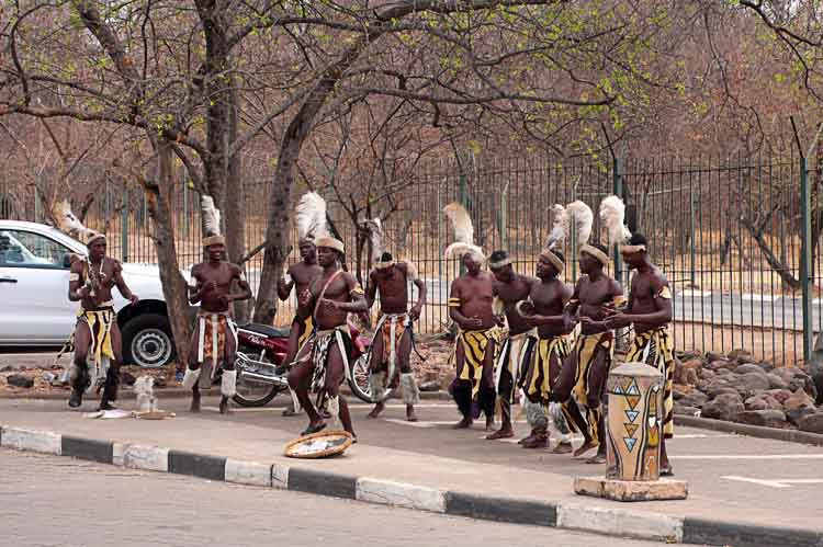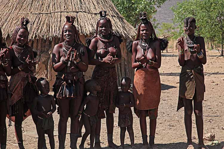Draußen sitzen im Kreis alle Frauen des Dorfes und bieten Handwerkskunst zum Kauf an. Michi ersteht einige Hals- und Armketten, Renate eine Kalebasse. Nun beginnt das Feilschen um eine Tanzvorführung. Das dabei eingenommene Geld dient der ganzen Gemeinschaft. Wir einigen uns auf N$ 400,-, also knapp € 40,-. Lt. Unserem Guide hätten sie auch für die Hälfte getanzt. Wir genießen die Vorführung und haben das Gefühl, dass mit der Zeit der Tanz nicht mehr für uns, sondern ausschließlich für die Himbas selbst ein Zeichen der Lebensfreude darstellt.