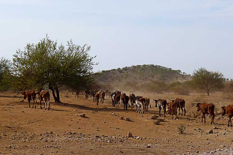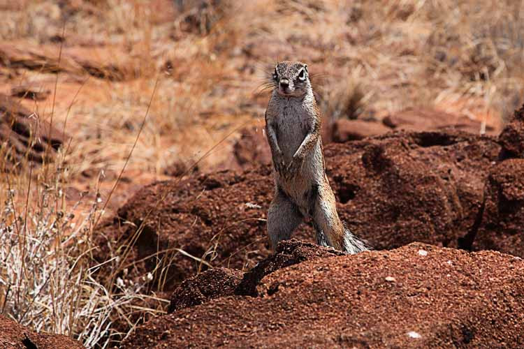 Wieder zurück zur Tankstelle, dann biegen wir auf die D707 ab und kommen durch eine wunderbare Landschaft. Rote Dünen, Berge und davor ein breiter Streifen Savanne.