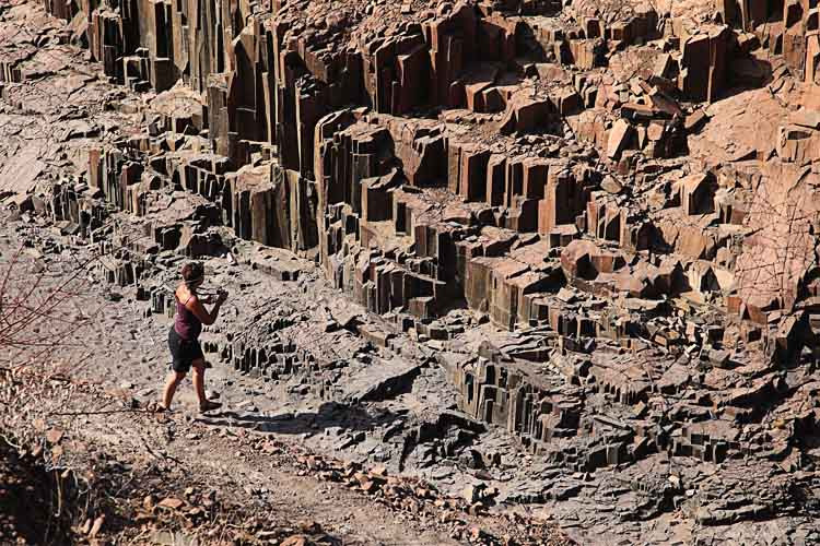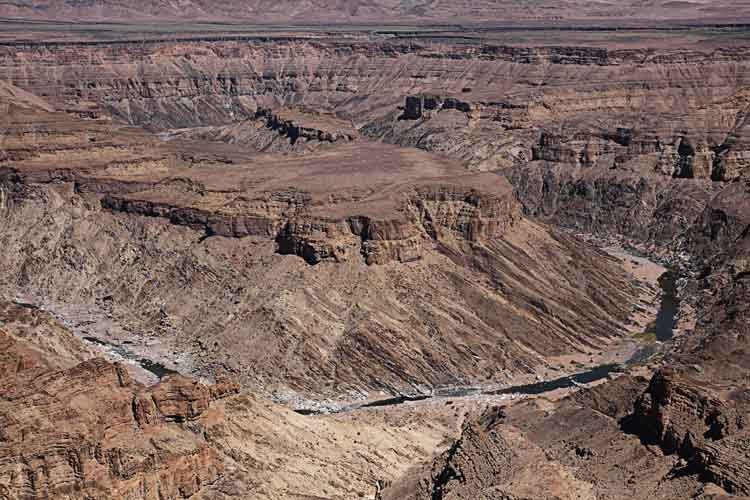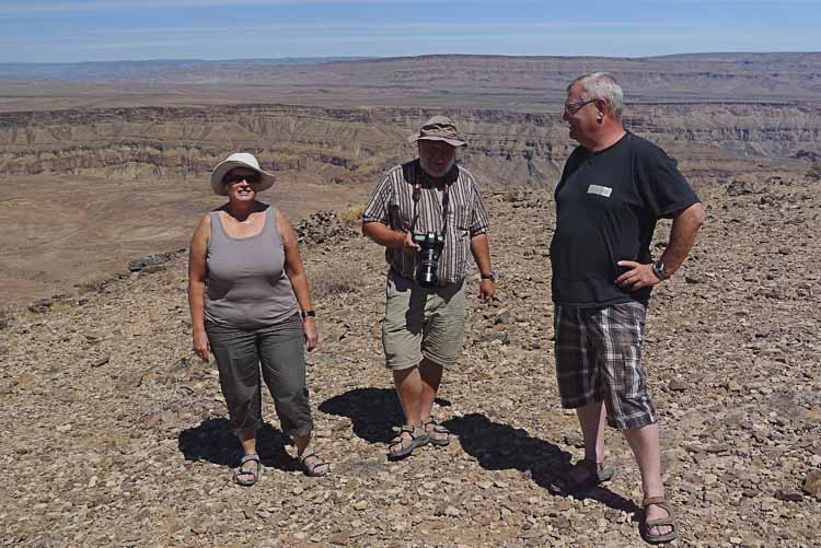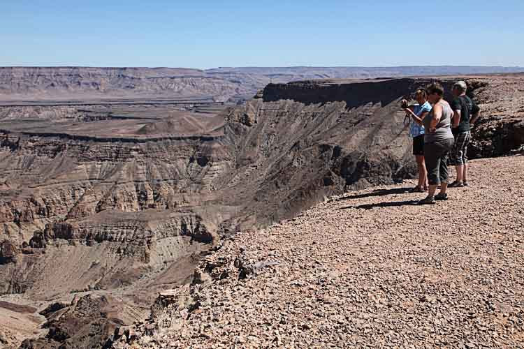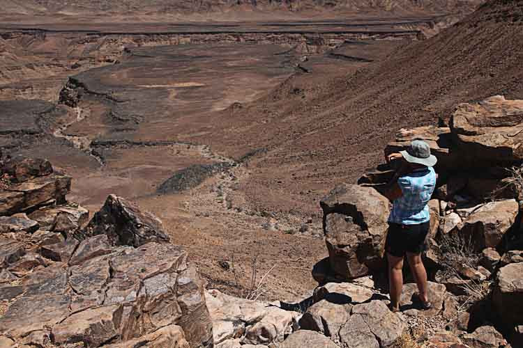 Nach knapp 90 min. Fahrt kommen wir in den Fish River Nationalpark. Wir lösen die Permits bei der Rangerin, die auffallend unfreundlich ist. Noch ein paar km, dann sind wir beim View-Point. Dort bleiben wir aber noch nicht stehen, sondern fahren bis ans südliche Ende der Straße. Dort geht es nur noch zu Fuß weiter. Eine halbe Stunde dauert der kleine Rundweg, die Hitze nimmt deutlich zu. Großartige Aussichten in die Tiefen des Canyons bieten sich hier.