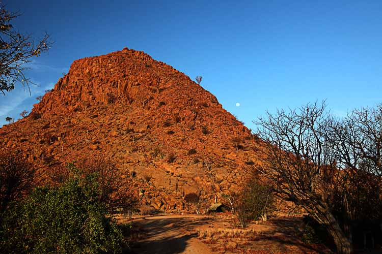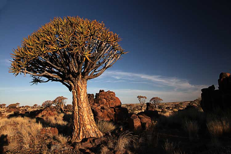Wir essen ausgezeichnet zu sehr moderaten Preisen. Nach dem Tanken fahren wir weite Richtung Grünburg. Wir verlassen aber schon nach wenigen km. die C10, um über eine D-Straße wieder Richtung Norden zu fahren ((D608). Sehr abwechslungsreich ist die Weiterfahrt, durch weite Ebenen und über gewundene Straßen zwischen den verwitterten Bergen durch. In Keetmanshoop finden wir eine tolle B&B Unterkunft. Lt. Reiseführer gibt es hier das beste Frühstück Namibias. Wir beziehen die Zimmer aber noch nicht, sondern fahren ca. 25 km nördlich zu einem Köcherbaumwald. Nachdem wir N$ 25,- pro Person gezahlt haben stellen wir die Autos auf einem Campingplatz ab. Wir streichen fast eine dreiviertel Stunde durch das Gelände, um den attraktivsten Baum für den Sonnenuntergang zu finden.