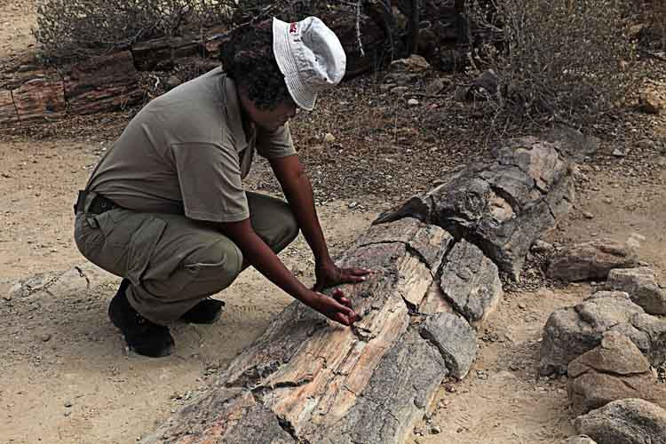 Tag 18, Sonntag, 28. 10. 2012 Um 07:30 Uhr gibt es Frühstück auf dem Campingplatz. Dann Fahrt in den Versteinerten Wald, wo wir wieder mit einem Guide unterwegs sind. Auch hunderte Jahre alte Welwitschias sind hier zu sehen.