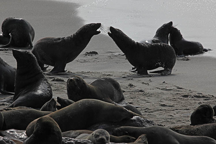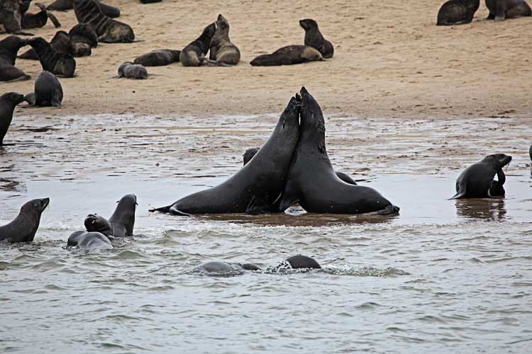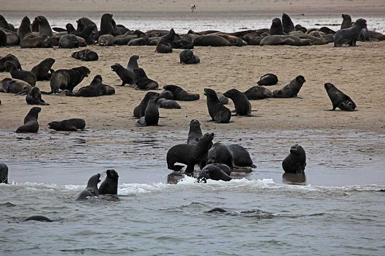 Am Cape Cross besuchen wir noch die riesige Seehundkolonie, bis zu 200 000 Tiere sind dort. Der Lärm und der Gestank sind ziemlich heftig. Wir haben aber schönstes Sonnenlicht, eher eine Seltenheit hier. Meist hüllt sich die Gegend in Nebel.