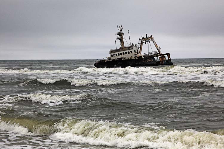 Tag 19, Montag, 29. 10. 2012 In der Nacht regnet es ein wenig, die Autos werden aber leider nicht viel sauberer. Frühstück gibt es um 08:00 Uhr. Wir fahren einkaufen in ein Spargeschäft, holen uns Geld beim Bankomaten und fahren dann los Richtung Swakopmunde. Schon nach 14 km biegen wir Richtung Strand ab, ein Schiffswrack gibt es hier zu besichtigen. Leider ist gerade Flut, so ist das Wrack ganz von Wasser umspült.