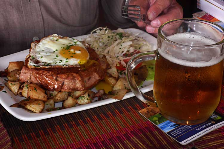 Ein Stück Stachelbeertorte, ein Stück Himbeertorte und 2 gute Kaffee lassen wir uns bringen. Dann gehe ich mit den beiden Damen noch ins Museum der Stadt. Das ist wirklich sehenswert, über Tiere des Landes bis zur Besiedelung durch Weiße, die Kulturen der Schwarzen usw. ist viel zu sehen. Nach einem Nachmittagtrunk im Brauhaus ziehen wir uns um, um erneut ins Brauhaus Abendessen zu gehen. Ich habe vor, einen Leberkäse zu essen, aber schauen wir mal, was es wirklich wird. Es wird tatsächlich ein Leberkäse für mich, mit Kartoffelpüree, Renate wählt ein Straußensteak, keiner isst die traditionelle Stelze.