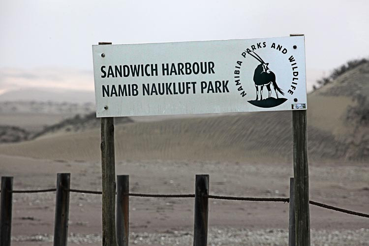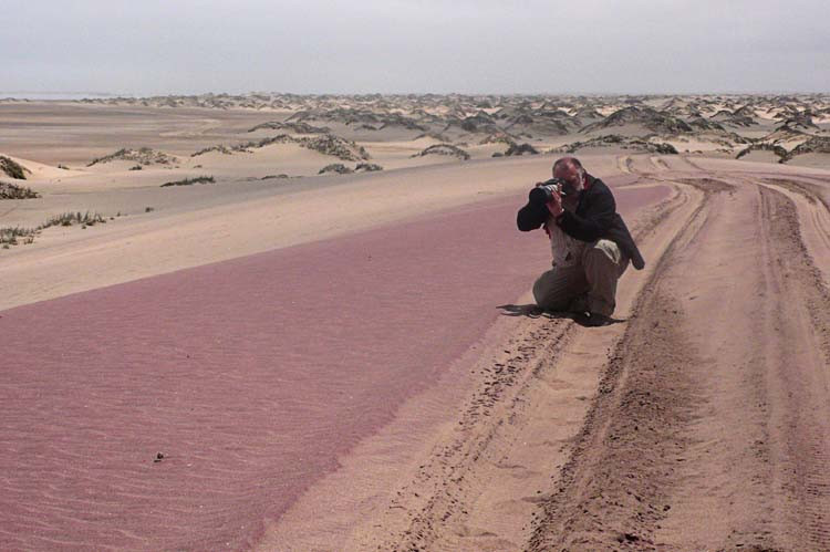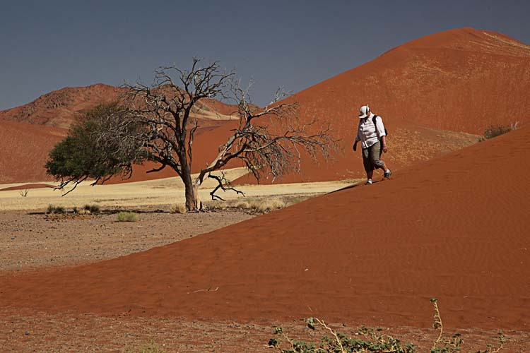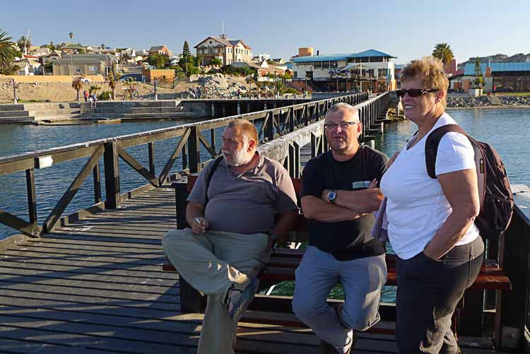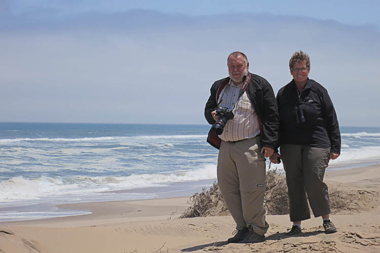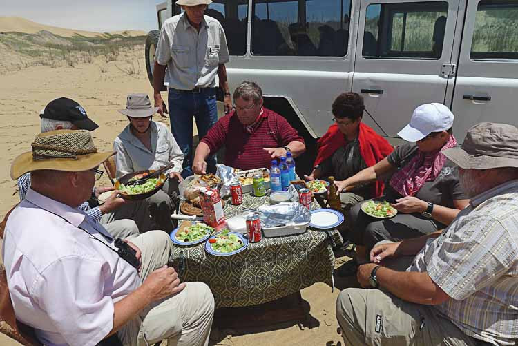 In einer gemischten Gruppe von 2 Londonern und einem Schweizer Ehepaar geht es zuerst nach Walfishbay, dann über Sand und durch Dünen bis zu einer Stelle, wo die Dünen direkt bis ins Meer reichen.