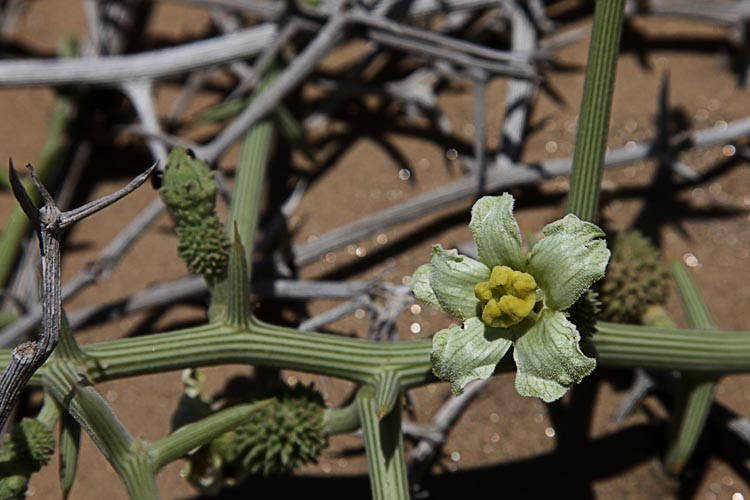 Eine seltsame Wüstenpflanze wächst in der Gegend, eigentlich unscheinbar mitten in den Sanddünen. Die Wurzeln dieser Pflanzen sind dick wie ein Baumstamm und reichen bis zu 45 m tief in den Sand, da ist immer frisches Wasser. Die Triebe der Pflanze wachsen immer wieder aus dem Sand der Wanderdünen. Die Früchte sollen wie Melonen schmecken, Michi versucht eine und sie ist extrem bitter. Unser Guide erklärt uns, dass die reifen Früchte in der Schale über Feuer gekocht werden und dann die Bitterstoffe verlieren.