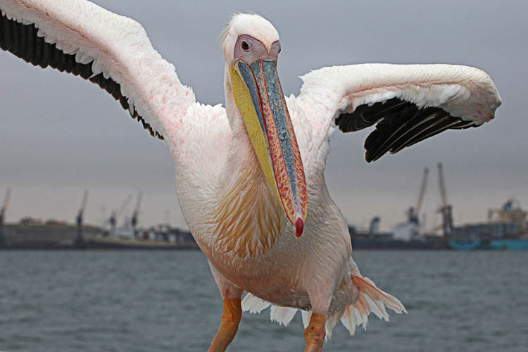 Tag 21, Mittwoch, 31. 10. 2012 Frühstück um 07:00 Uhr. Schon vorher räumen wir die Zimmer und schaffen das Gepäck in die Autos. Um 08:00 Uhr werden wir zur Schifferlfahrt mit einem Kleinbus abgeholt. Wir werden zum Office des Reiseveranstalters gebracht, um die Tickets zu bezahlen. Dann fahren wir nach Walfishbay und steigen nach kurzer Wartezeit auf den Motorkatamatan um. Schon kurz nach dem Ablegen werden Pelikane angelockt, auf das Boot zu fliegen.