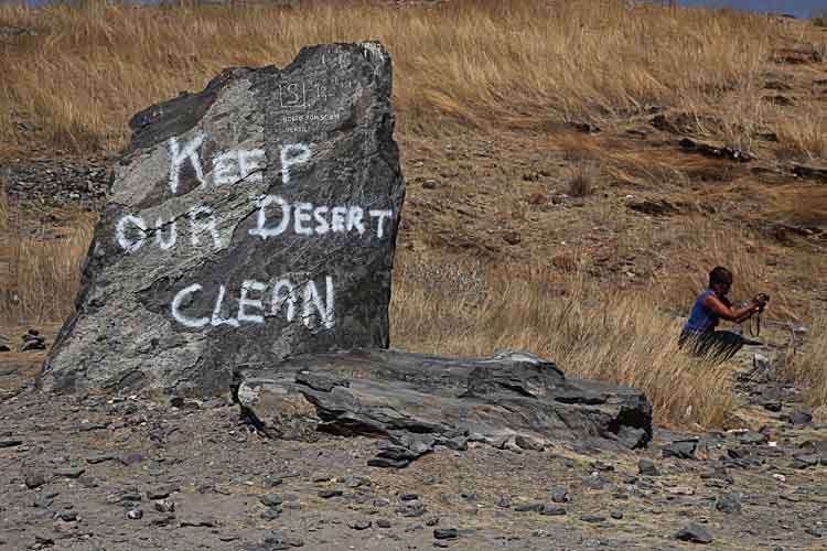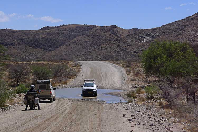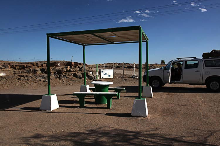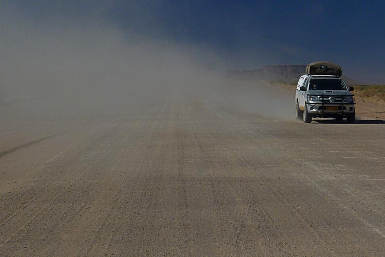 Wir halten Kaffeepause, das heiße Wasser stammt noch vom Hotel. Das Licht wird deutlich flacher, der Reiz der Schatten ist vorbei. Bei unserer Abfahrt zu Mittag sind wir auch die letzten Besucher. Erst am Abend werden die Gäste wieder aufkreuzen. Wir fahren ca. 50 km nach Ai-Ais. Die Straße ist staubig, führt aber durch unwirklich tolle Landschaften.