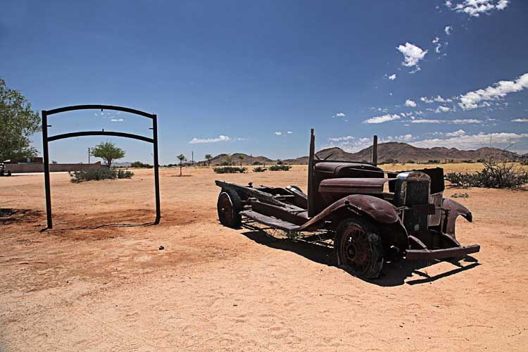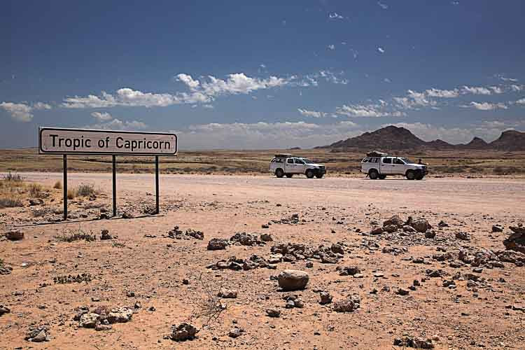 Tag 22, Donnerstag, 1. November 2012 Frühstück um 8:00 Uhr, dann Abfahrt Richtung Walfishbay. Von dort zweigen wir ab auf eine unbefestigte Straße, auf der wir bis Solitaire fahren, dabei queren wir auch den südlichen Wendekreis. Ich weiß jetzt warum das Kartenspiel nach diesem Ort benannt ist: Die Einsamkeit veranlasst die Bewohner, mit sich selbst Karten zu spielen. Dort verabsäumen wir es nicht, in der Desert-Bakery einen Apfelstrudel mit Kaffee zu genießen.