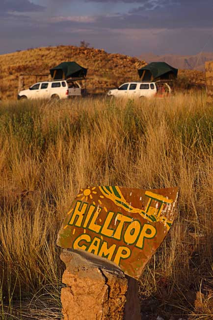 Wir jausnen auf der Paßhöhe, bevor wir uns in die Abgründe stürzen. Bis zu 25% Gefälle, teils auf Schotterpiste, sind zu bewältigen. Ist aber für uns kein Problem, mit dem 1. Gang brauchen wir noch nicht einmal den 4 WD. Gegen 16:00 Uhr kommen wir am Gecko-Camp an.