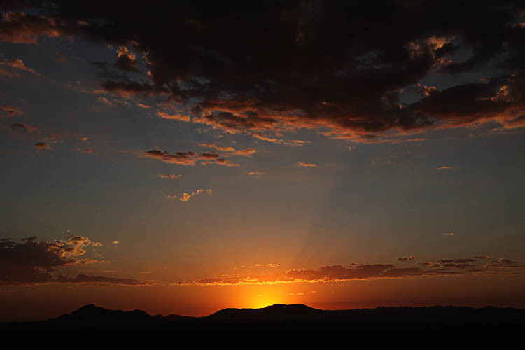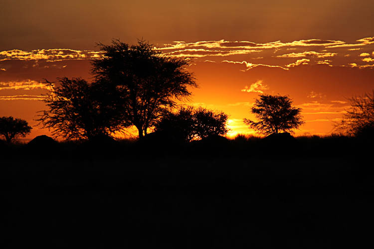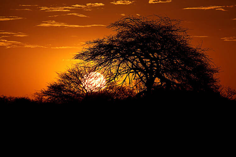 Wir erleben ganz auf der Spitze eines Hügels einen tollen Sonnenuntergang und leider in der uns zu Füßen liegenden Steppe kein einziges Tier. In der Nacht wird es ziemlich frisch.