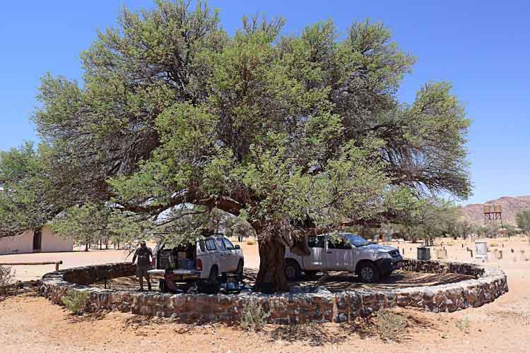 Unter einer großen Fächerakazie halten wir Rast und jausnen. Dann geht es durch schier endlose Weiten Richtung Keetmanshoop. Wir kommen zur Brücke über den Fishriver.