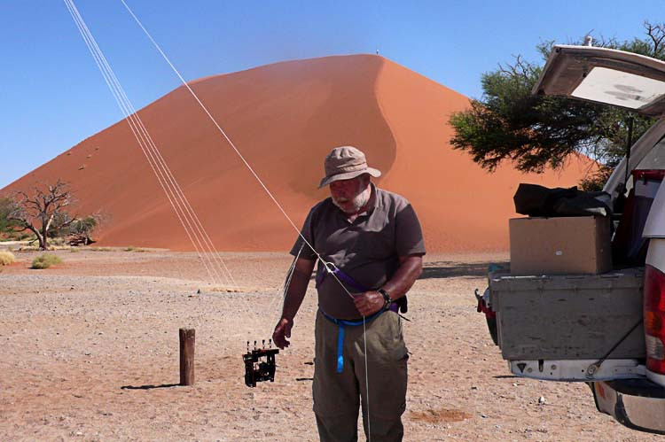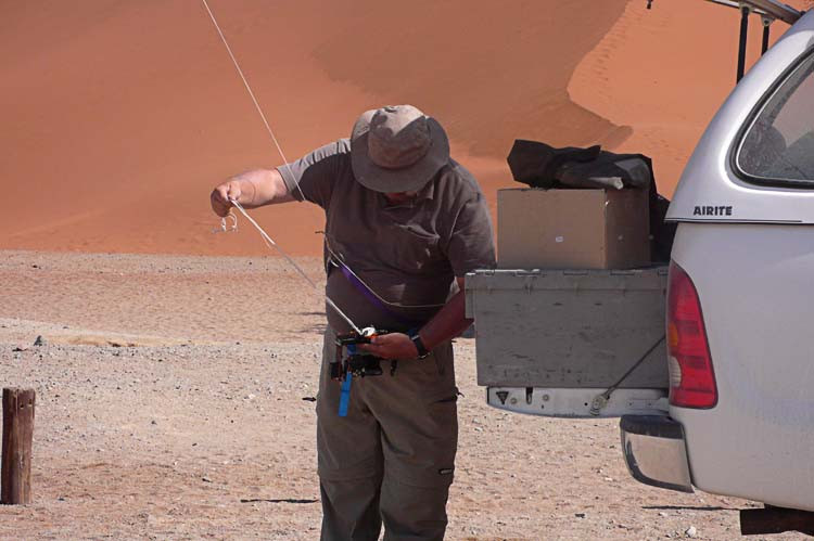 Ich baue den Kap-Drachen auf und bei fast zu viel Wind gelingen einige Aufnahmen.