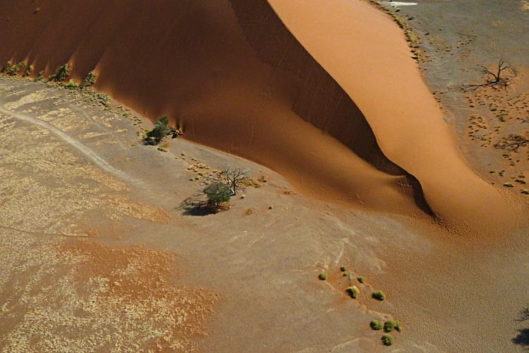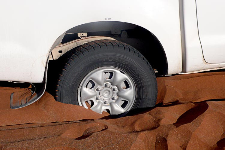 Dann fahren wir weiter nach Sussuflei. Die letzten 5 km geht es durch weichen Sand. Wir merken bald, dass wir vergessen haben, den Reifendruck zu reduzieren und sitzen im Nu fest. Hier hilft kein Low-Gear mehr und auch keine Differenzialsperre. Wir holen die Schaufel und nach 10 min. graben und Luftauslassen geht es mit knapper Not wieder weiter.