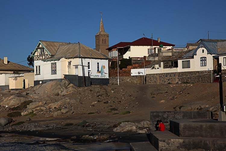 Kurz vor der Stadt Aus kommen wir auf die Asphaltstraße, die von Keetmanshoop nach Lüderitz führt. In Aus gehen wir ins Bahnhofshotel, Kaffee und Kuchen schmecken ausgezeichnet. Eine gute Stunde brauchen wir dann für die 122 km nach Lüderitz.