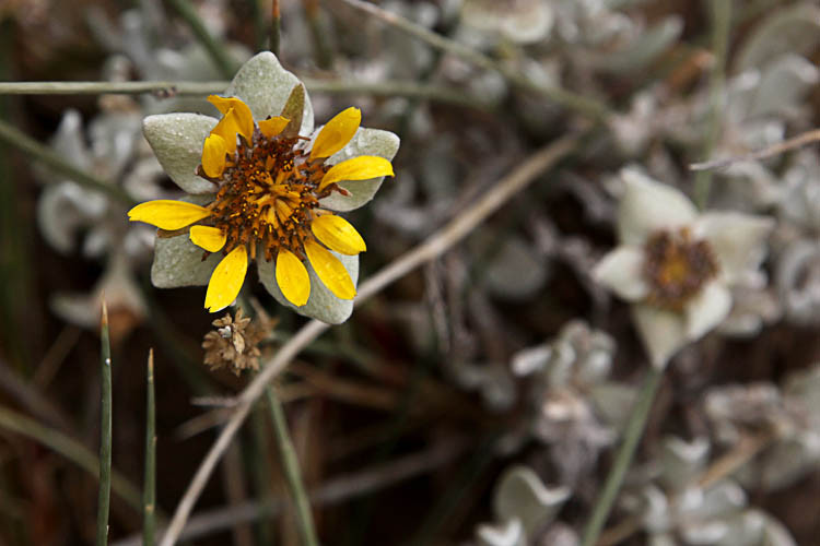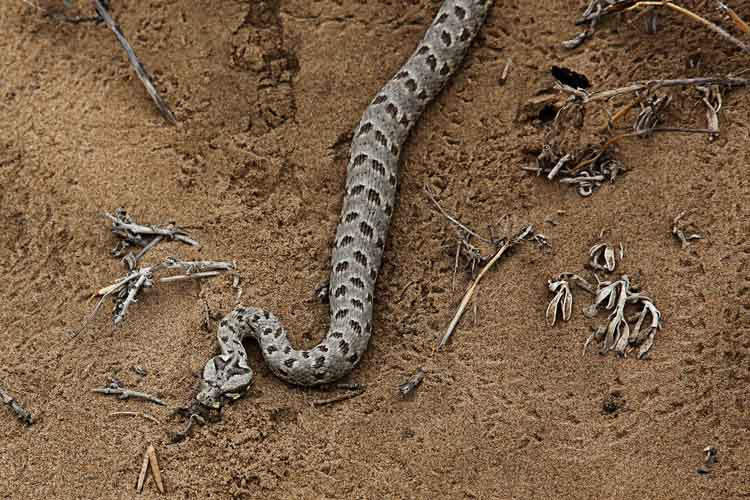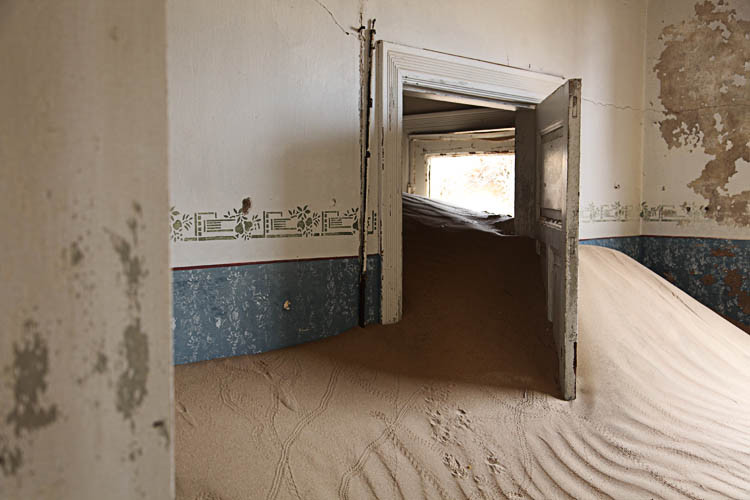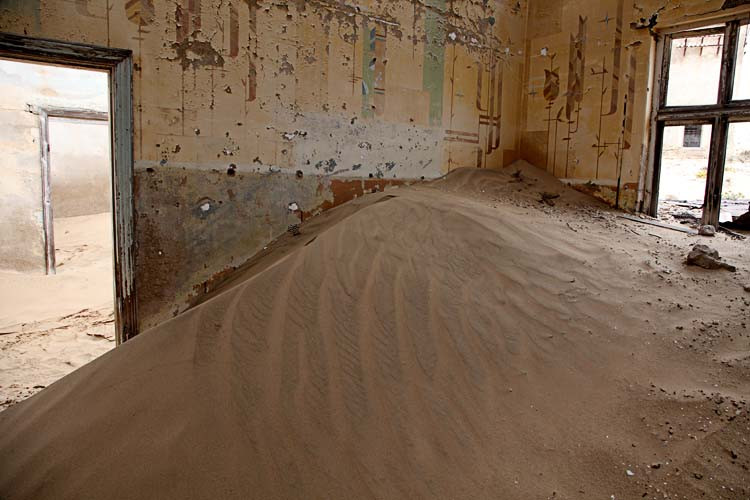Tag 25, Sonntag, 4. November 2012 Frühstück um 07:45 Uhr. Dann fahren wir bei leichtem Nieselregen tanken. Weiter in die Geisterstadt Kolmannskop. Bei der Einfahrt ist ein Permit zu lösen, das kostet N$ 110,- für 2 Personen. Der Sand erobert nach und nach alle Häuser, in manchen reichen die Verwehungen schon fast bis an die Decke. 1957 hat der letzte Bewohner die Stadt verlassen, seitdem wohnt hier niemand mehr. Mittendrin stolpert Michi fast über eine Hornviper, ab jetzt sind wir noch vorsichtiger. Auf dem Höhenrücken blühen verschiedenste Blumen, wie sie mit dem Wasserhaushalt tun bleibt uns ein Rätsel.