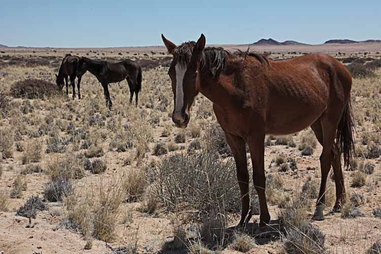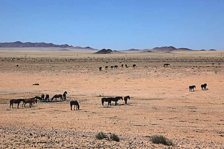 Dann heißt es weiter Richtung Aus. Ca. 20 km westlich von Aus kommen wir zu einem View Point mit Aussicht auf Namib-Wildpferde. Wir haben unwahrscheinliches Glück, von der Gesamtpopulation von ca. 200 bis 300 Stück ist eine Gruppe von 40 Pferden direkt neben der Straße.