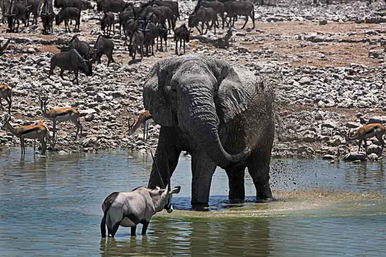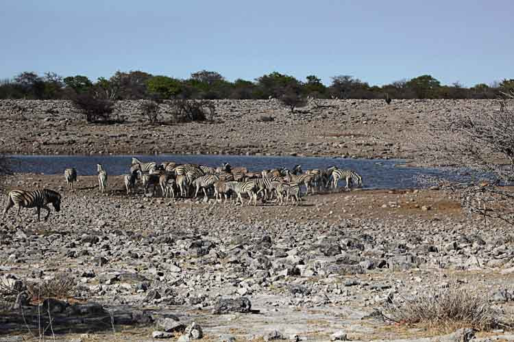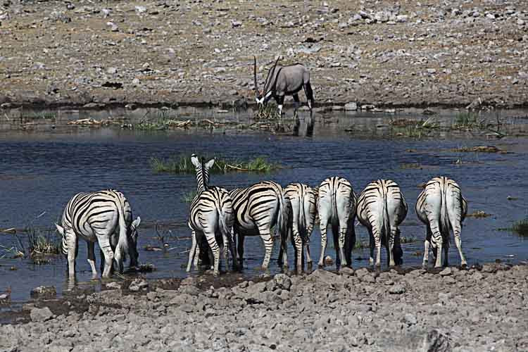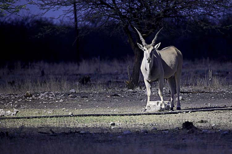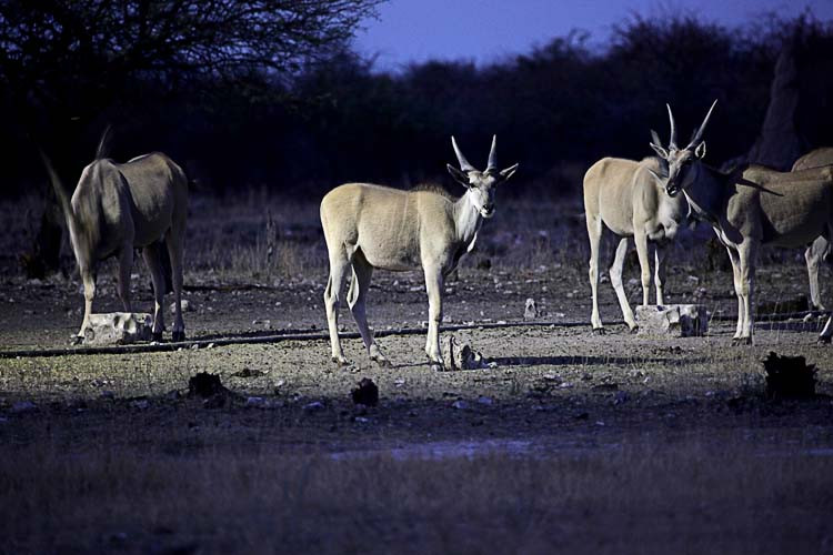 Dann: Auf in den Pool! Für das Abendessen ist Zebra- Gordon Bleue angekündigt. Das wird nach einem Bruscetto mit Zebraschinken serviert und schmeckt ausgezeichnet. Am beleuchteten Wasserloch können wir dann noch einige beeindruckende Antilopen bestaunen.
