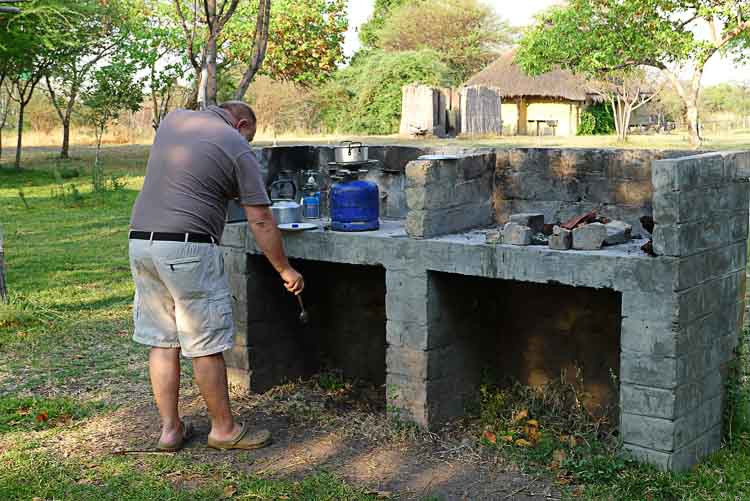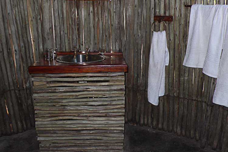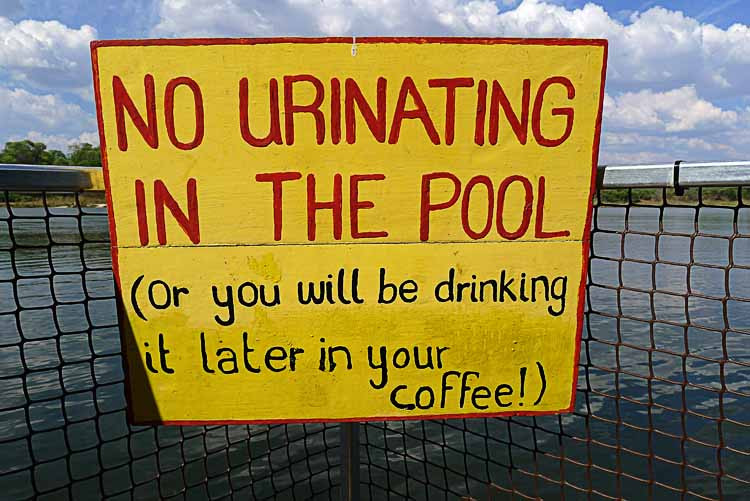 Zu unserem alten Camp wollen wir auch nicht mehr zurück, obwohl für 2 Nächte gebucht war. Wir sehen uns das Ngepi Camp an und finden es auf Anhieb einfach super. Mit Flusspool direkt im Okowango, witzigen Orientierungstafeln und Regeln. Auch die Toiletten und Duschen sind echt fantastisch und fantasievoll gestaltet, hier schlagen wir für diese Nacht die Zelte auf. Der Nachmittag wird mit Nichtstun verbracht. Kaffeetrinken, aalen im Schatten, in der Sonne ist es viel zu heiß und natürlich nehmen wir ein Bad im Hippofluß-Pool. Das Wasser hat fast 30°, herrlich. Erst ein weiter stromaufwärts kotendes Flußpferd läßt uns blitzschnell den Pool verlassen. Abendessen gibt es in Form eines Buffets mit 3 Gängen, wirklich lecker.
