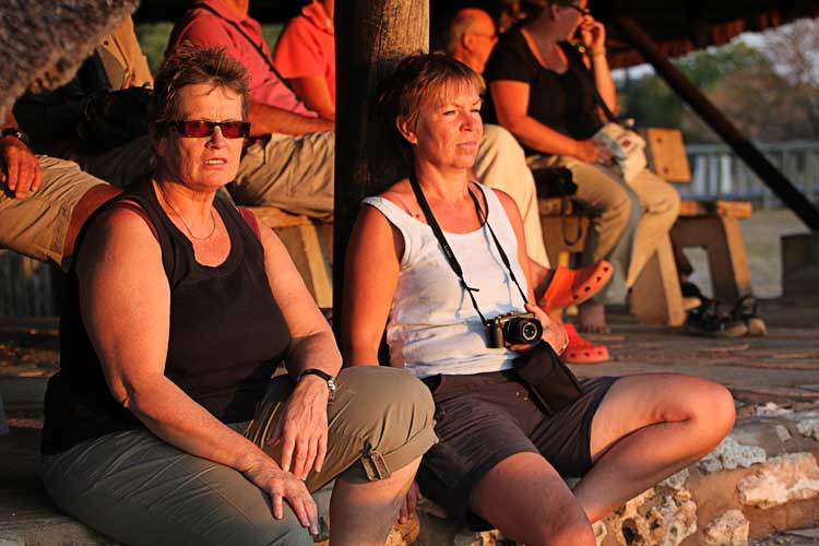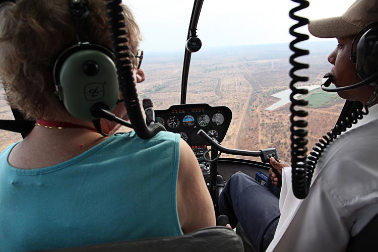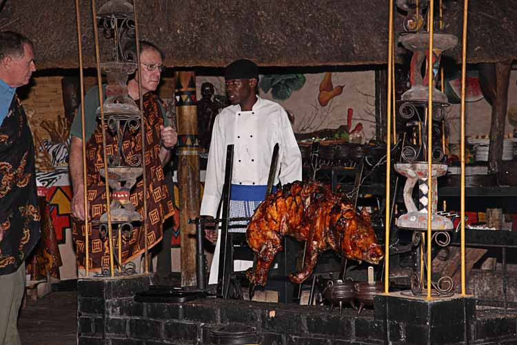 Tag 3, Samstag,13.10.2012 In der Früh buchen wir gleich den Helikopterrundflug über die Wasserfälle. Mit dem Bus fahren wir dann zu den Victoriafalls. Der Rundgang von 3 Stunden beeindruckt uns sehr, immer wieder bleiben wir stehen und fotografieren. Die Gischt wirbelt auf, dass wir uns vorkommen, als wenn wir im Regen stünden. Im Nu sind wir nass bis auf die Haut, aber das ist angenehm und schon 15 Minuten später sind wir wieder trocken. Gegen Mittag fahren wir auf den Markt, wo Kunsthandwerk angeboten wird. Wir kaufen Holz- und Steingiraffen. Danach bringt uns der Bus wieder zur Lodge zurück. Wir gehen Mittagessen ins Restaurant Loukothula und 13:00 Uhr versäumen wir nicht die Fütterung der Geier. Der Himmel verdunkelt sich, so viele Tiere drehen ihre Kreise. Anschließend sitzen wir noch bei Salat und Burger auf der Terrasse mit Blick auf das Wasserloch. Beim Zurückgehen zur Lodge sehen wir, dass gerade auch Roland und Anhang zurück kommen. Wir werden zum Kaffee eingeladen danach werden wir zum Helikopterflug abgeholt. Wir sind zu dritt, Tante Poldi begleitet uns. Ein grandioses Erlebnis $130,- für 15 min. pro Person. Jetzt warten wir schon gespannt auf das Boma-Essen heute Abend. Während Renate das Tagebuch schreibt, hält ein Rudel Warzenschweine das Gras vor unserer Terrasse kurz. Das Boma-Essen ist ganz lustig, bis aufs Essen. Beim Eingang werden wir gleich afrikanisch eingekleidet. Vor dem Essen geht der Kellner mit einer Schüssel Wasser zum Händewaschen durch und dann bekommen wir eine Kostprobe vom afrikanischen Bier im Emaille-Häferl (Sauer und Bäähh). Die Vorspeise können wir uns aussuchen und sie wird auch serviert. Alles andere gibt es vom Buffet. Das Fleisch ist leider nicht so gut, ziemlich zäh, trocken und hart. Nur Michi hat Glück, ihre Portionen sind alle wunderbar. Nach dem Essen werden Trommeln verteilt und alle trommeln mit der Band. Danach werden noch afrikanische Tänze vorgeführt. Um 22:00 Uhr gehen wir noch an die Bar und stärken unser Immunsystem mit Gin Tonic.
