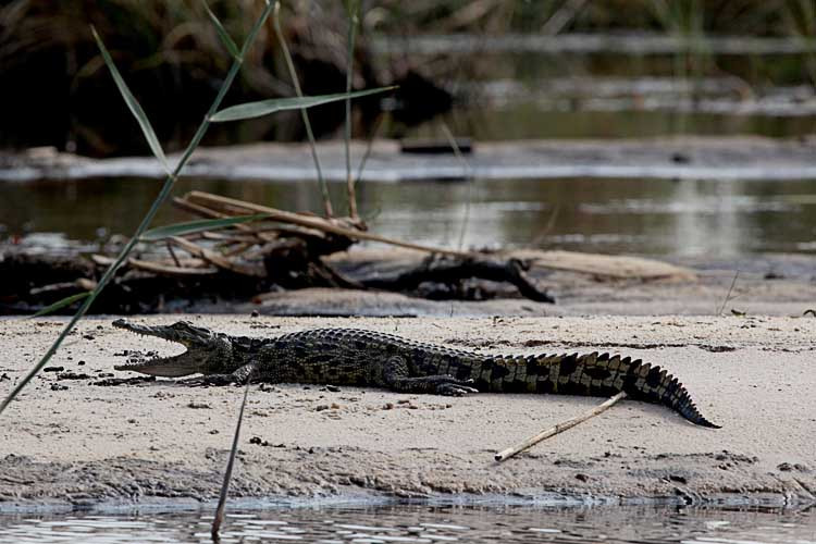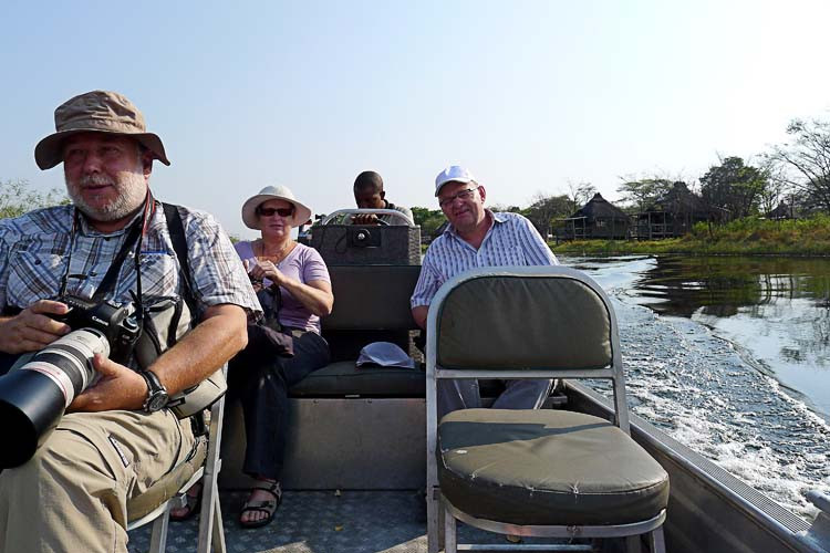 Tag 6, Dienstag, 16. 10. 2012 Um 06:00 Uhr wecken, Flußpferde verjagen, 07:00 Uhr Frühstück. 08:008 – 10:00 Uhr Flussfahrt auf dem Kwando River. Wir sehen viele Vögel, Wasserbüffeln und Elefanten, ein kleines Krokodil und einen Waran, aber leider keine Hippos.