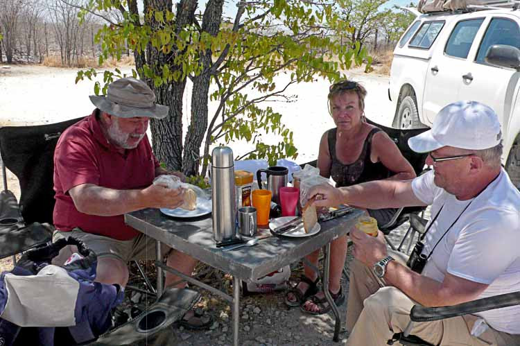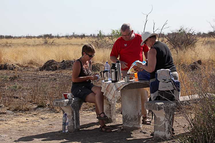 Um 07:00 Uhr ist dann allgemeine Tagwache. Wir gehen Frühstück fassen, alle essen 2 Spiegeleier auf Brauntoast mit gebratenem Speck. Wir checken aus, der Preis hat uns fast umgeworfen: für die Nächtigung, ein Bier und 4 Gin-Tonic, das Abendessen mit Haupt und Nachspeise kosten alles in allem ca. € 25,- pro Person. Da läßt es sich leben! In Bagani tanken wir, es passen fast 80 l hinein. Der gestrige 4x4 Track hat scheinbar ganz ordentlich geschluckt. Aber bei einem Dieselpreis von ca. € 1,08 ist es uns das wert.