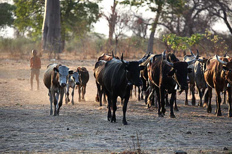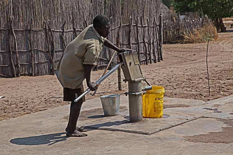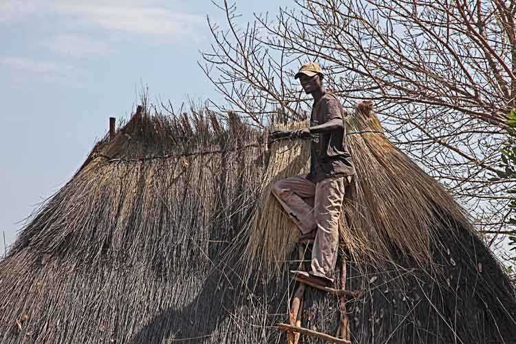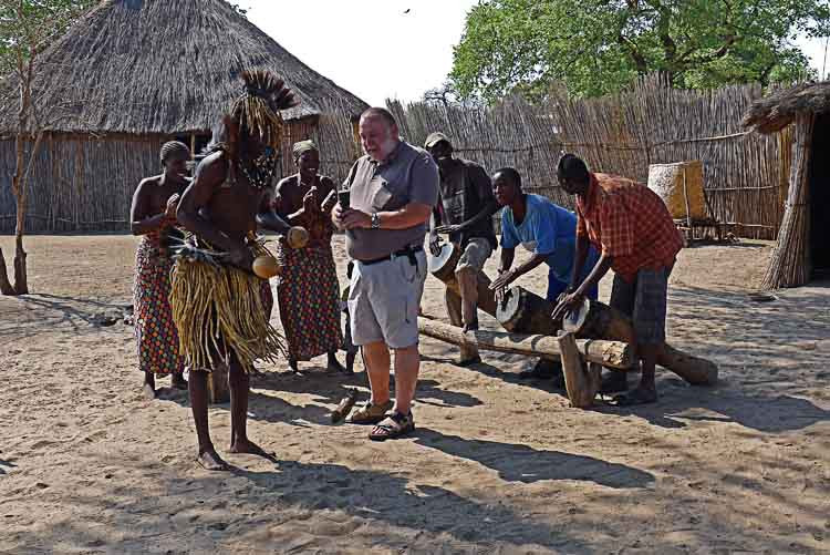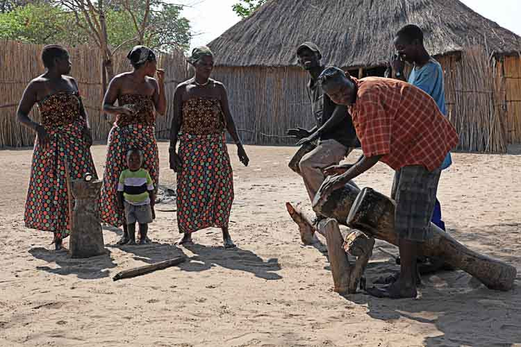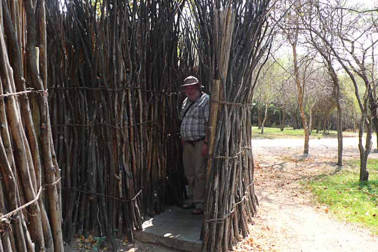 Wir besichtigen das Traditional Village gegen eine Gebühr von 200 Rand. Von einem Führer werden wir zuerst in den Kral von Großvater und -mutter geführt. Wir sehen verschiedene Dinge aus dem Alltagsleben: Getreidespeicher, Mause-, Mungofallen, Pfeil und Bogen, sowie ein Bett. Und ein trommelartiges Teil zum Anlocken der Hippos. Dann gehen wir noch in durch ihr Dorf, in dem sie den Alltag leben. Wir sehen den Aufbau der Hütten, Zäune, einen Brunnen (1995 gebaut), sowie ihren Einkaufsmarkt.
